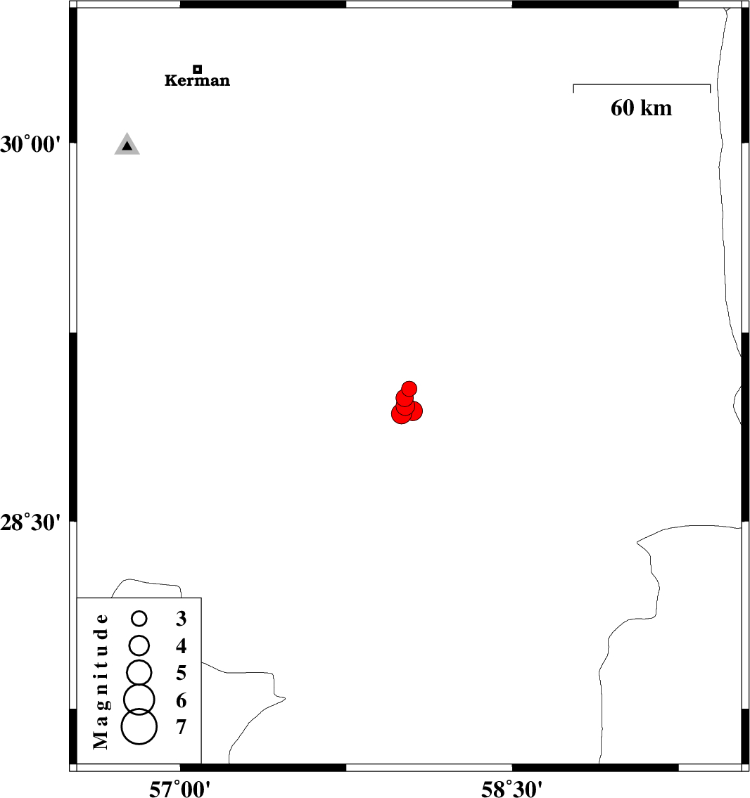 | 2024/03/07 | 17:27:03.9 | 20:57:03.9 | 28.939 | 58.05 | 8 | ML:3.9 | Kerman Province, 35 km South-West of Bam |