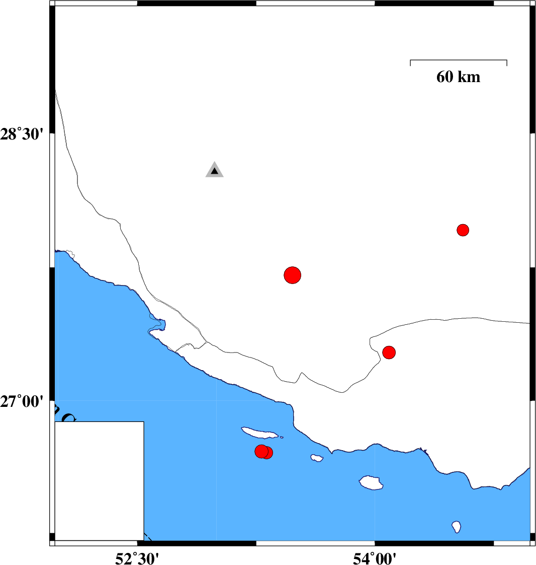 | 2024/03/13 | 23:58:17.3 | 03:28:17.3 | 26.705 | 53.316 | 12 | ML:3.5 | Persian Gulf, 71 km South-East of Lamerd | ||