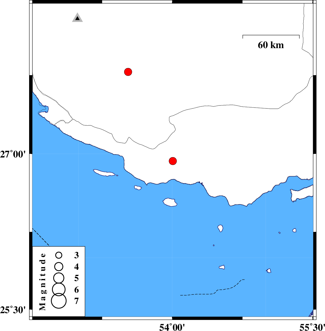 | 2024/04/03 | 06:56:22.1 | 10:26:22.1 | 26.931 | 54.006 | 12 | ML:3.6 | Hormozgan Province, 46 km South-West of Bastak | ||