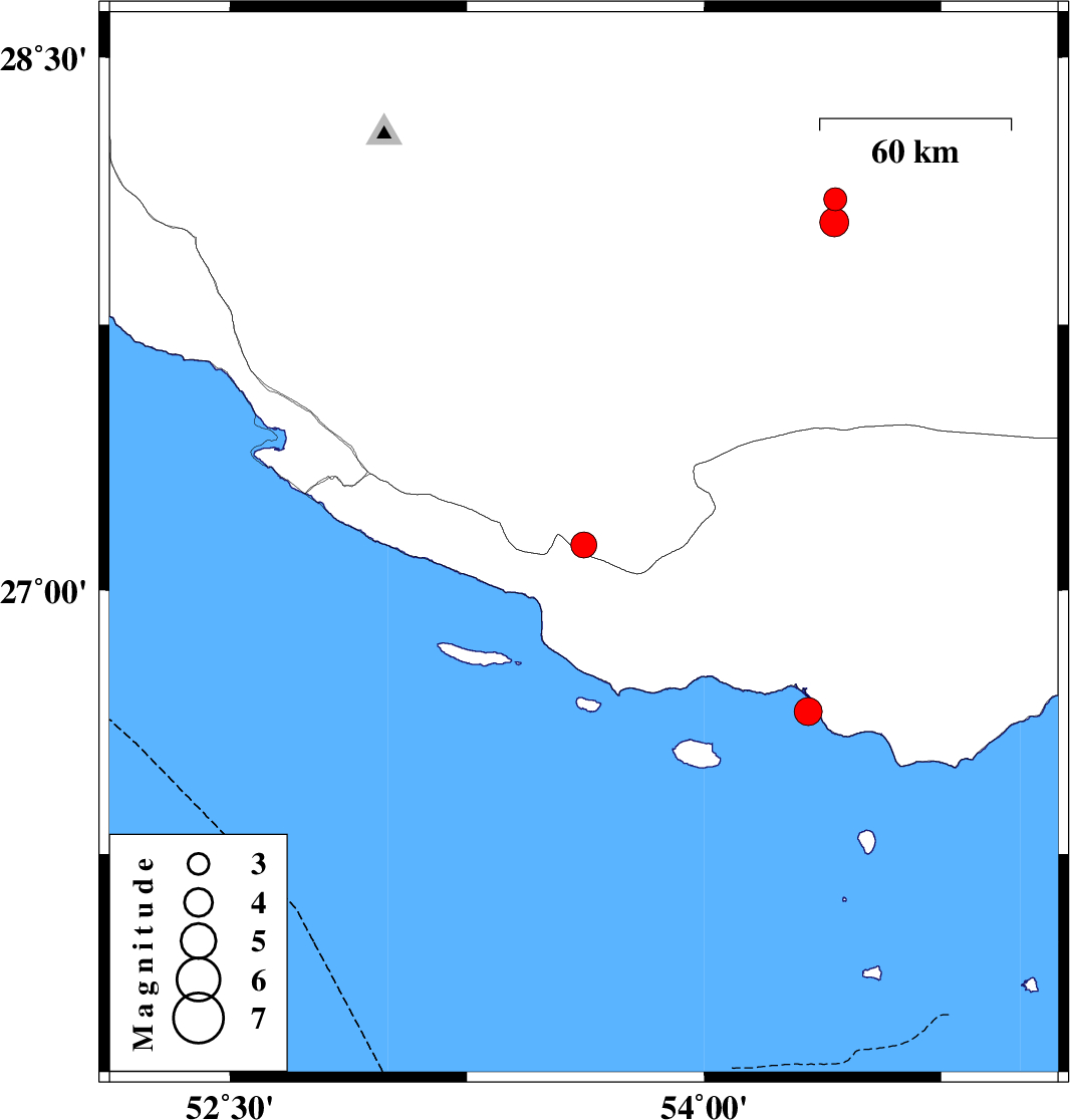 | 2024/04/06 | 04:54:51.5 | 08:24:51.5 | 26.655 | 54.329 | 12 | ML:3.9 | Persian Gulf, 60 km South of Bastak | ||