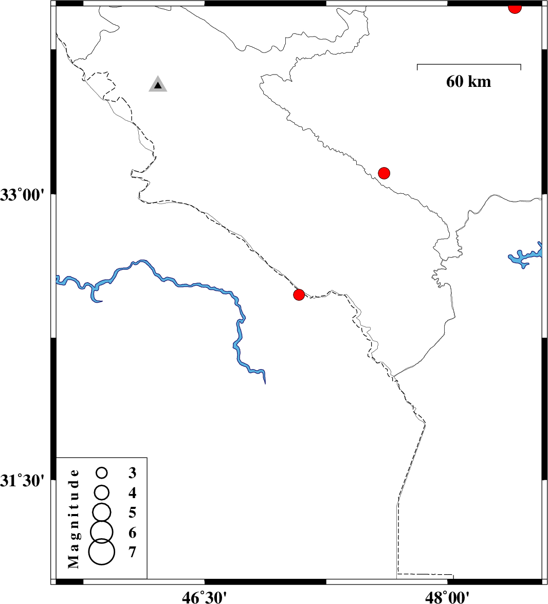 | 2024/03/17 | 09:48:54.2 | 13:18:54.2 | 33.109 | 47.607 | 12 | ML:3.3 | Lorestan Province, 11 km -West of Pol-e dokhtar | ||