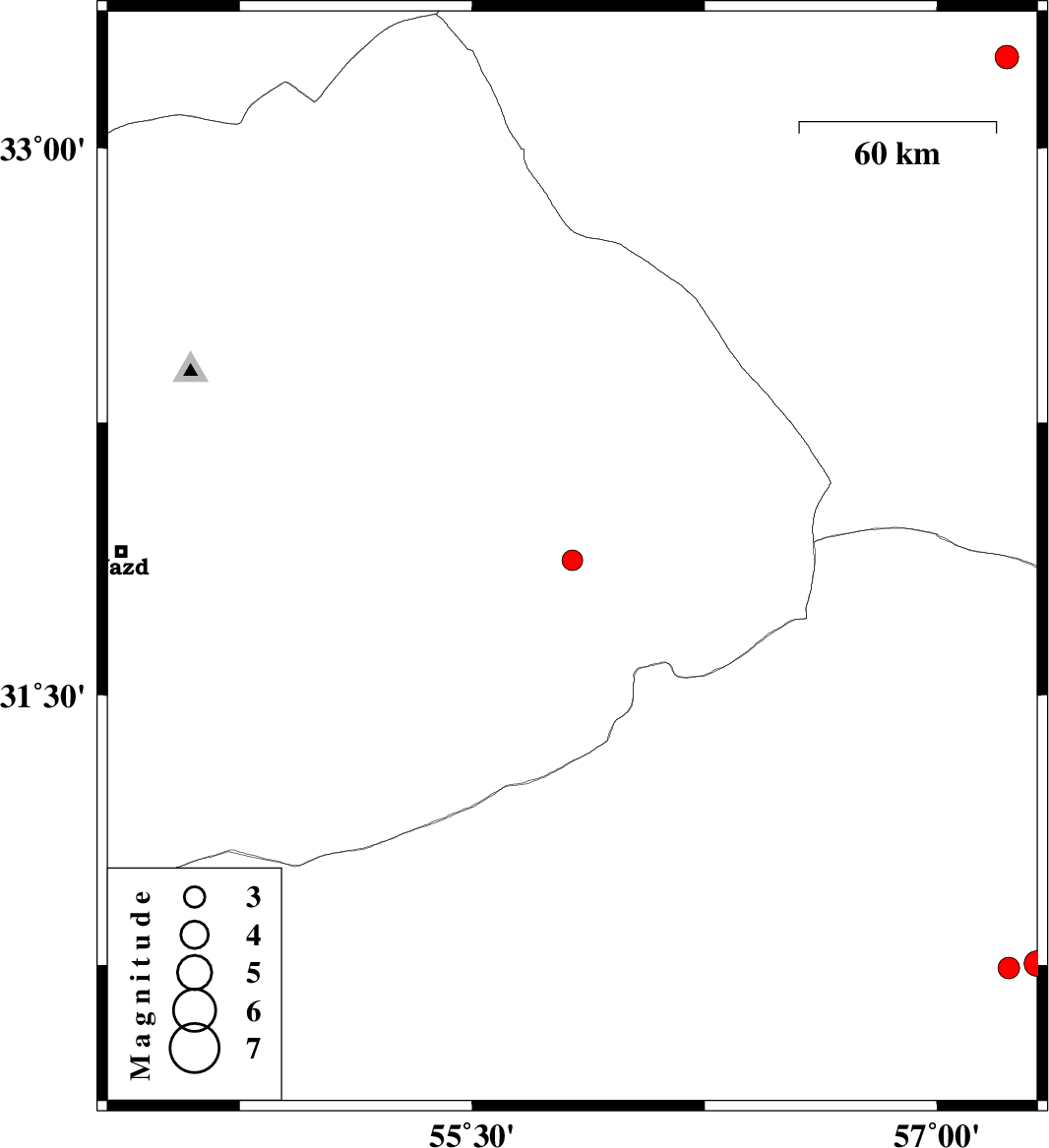 2024/04/01 | 13:44:03.6 | 17:14:03.6 | 33.247 | 57.225 | 7 | ML:3.4 | Yazd Province, 48 km South-East of Tabas | ||
