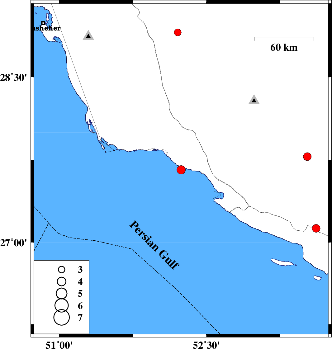 | 2024/04/24 | 09:34:00.5 | 13:04:00.5 | 27.661 | 52.243 | 12 | ML:3.9 | Persian Gulf, 20 km South of Jam | ||