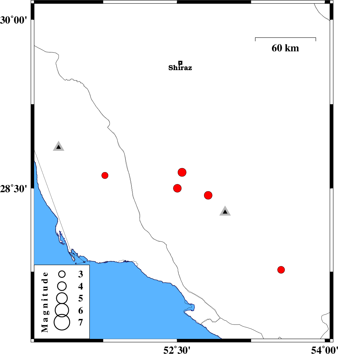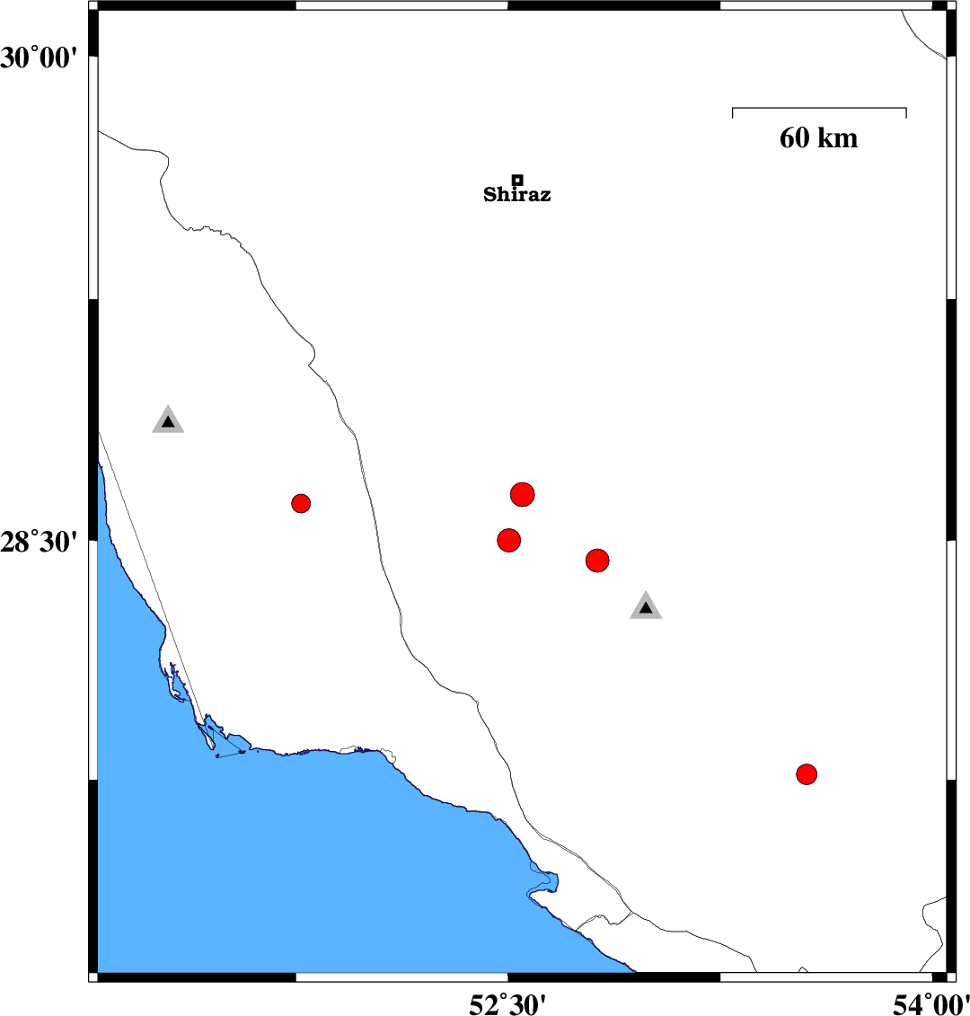 | 2024/06/03 | 10:46:41.1 | 14:16:41.1 | 28.642 | 52.55 | 12 | ML:3.8 | Fars Province, 21 km South of Firuz Abad | ||