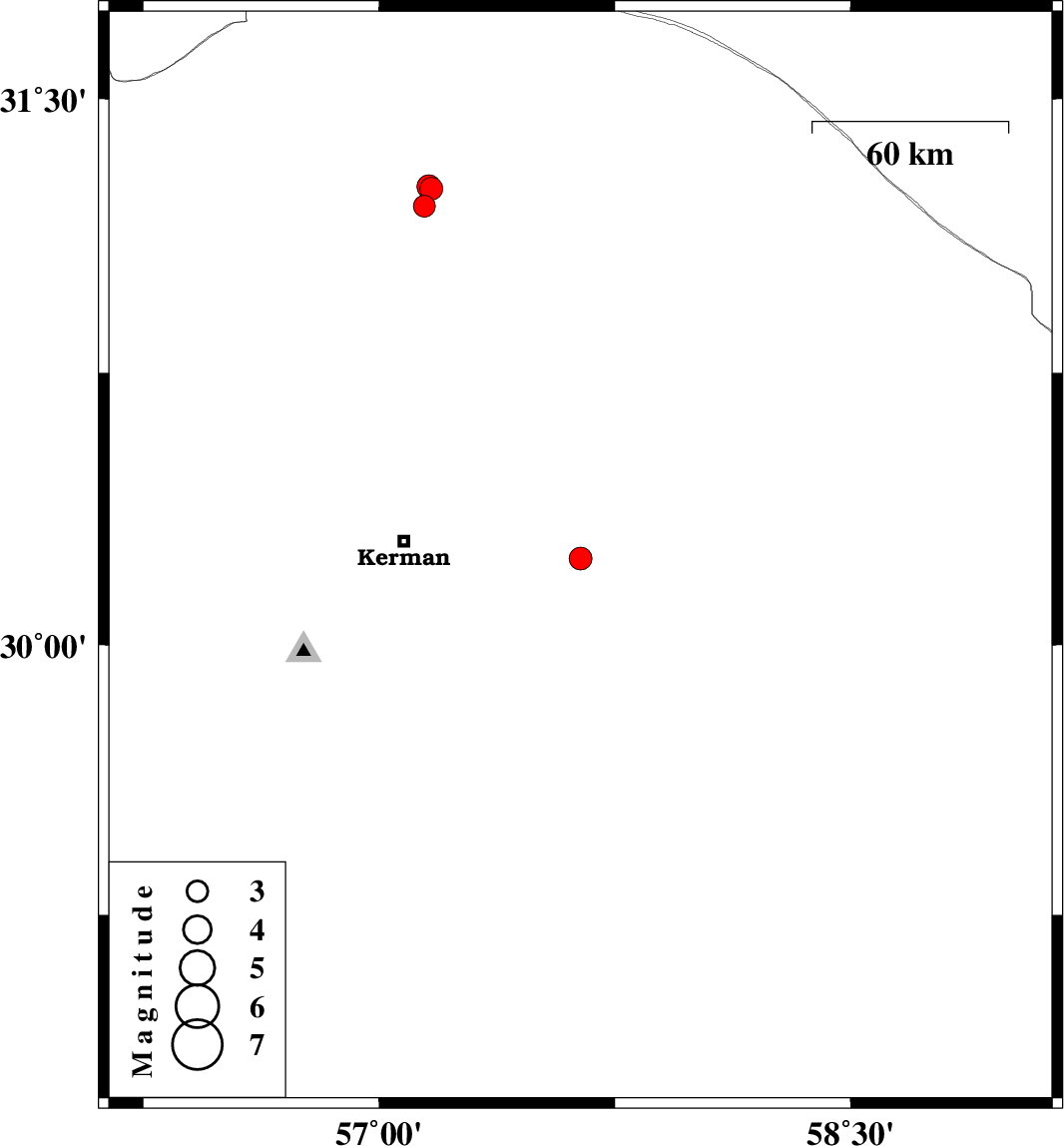 2024/06/07 | 08:48:34.3 | 12:18:34.3 | 30.239 | 57.641 | 12 | ML:3.3 | Kerman Province, 54 km -East of Kerman | ||