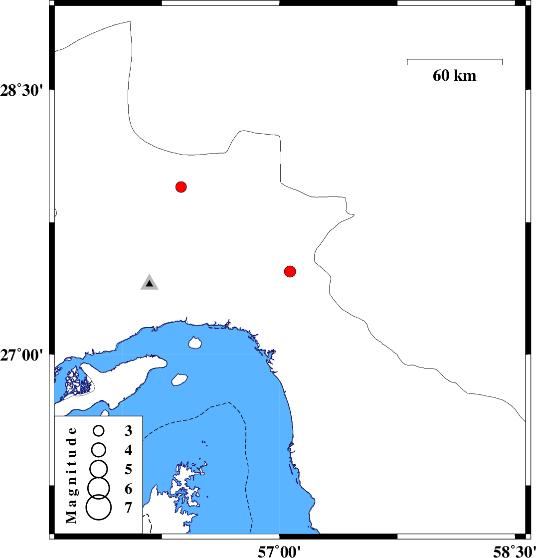 2024/06/08 | 16:18:28.5 | 19:48:28.5 | 27.472 | 57.066 | 10 | ML:3.2 | Hormozgan Province, 18 km -West of Dehbarez | ||