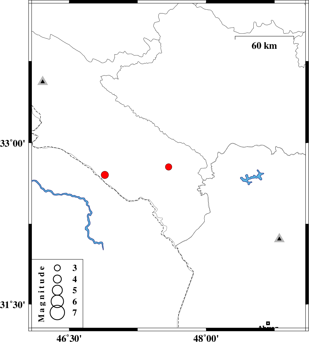 | 2024/06/17 | 05:45:13.7 | 09:15:13.7 | 32.778 | 47.589 | 12 | ML:3.3 | Ilam Province, 20 km South-East of Abdanan | ||