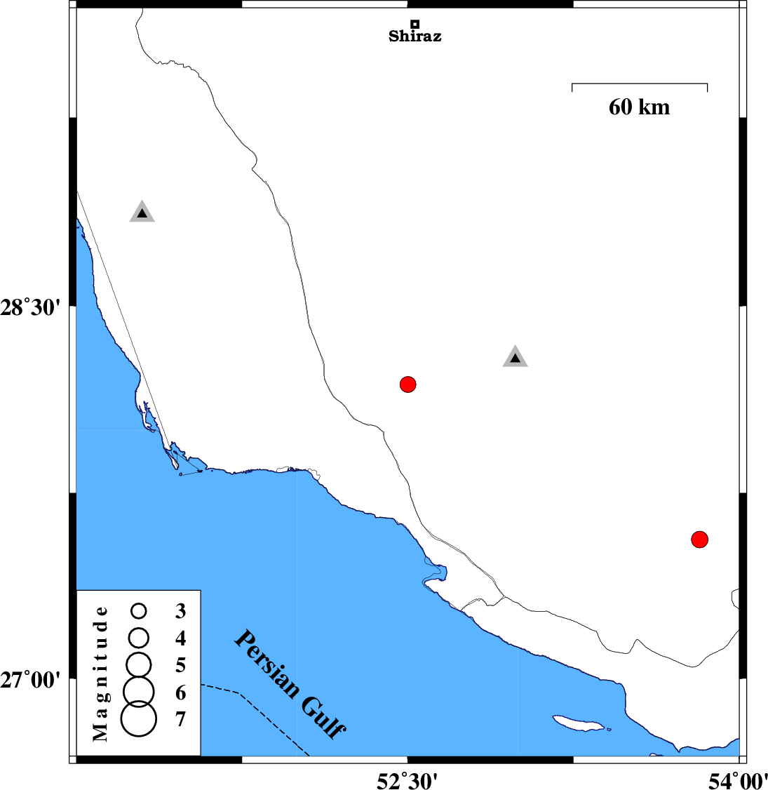 | 2024/06/28 | 22:25:36.7 | 01:55:36.7 | 28.185 | 52.501 | 12 | ML:3.3 | Fars Province, 43 km North-East of Jam | ||