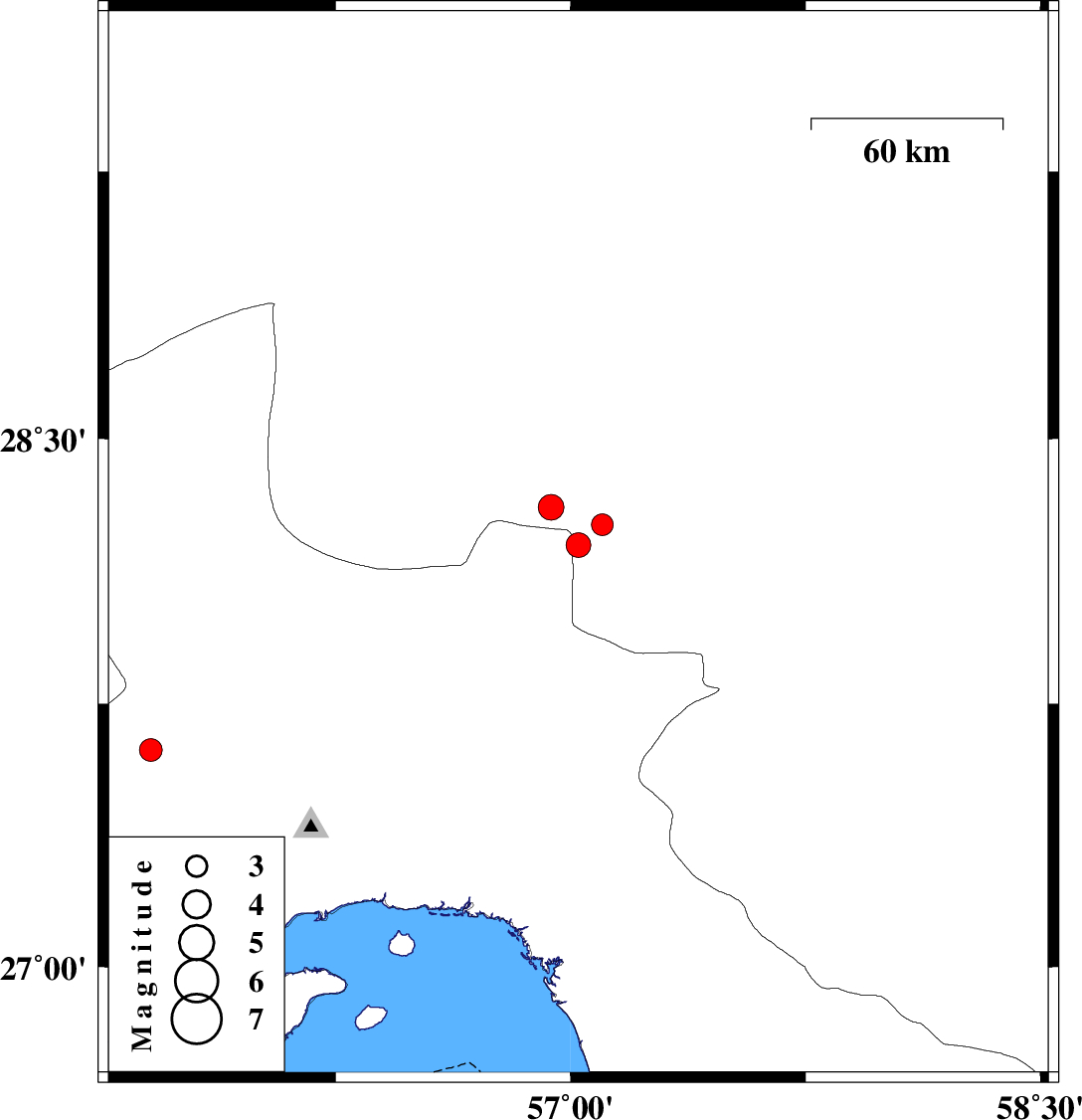| 2020/09/01 | 15:11:42.0 | 19:41:42.0 | 28.2 | 57.025 | 30 | ML:3.5 | Kerman Province, 71 km North-West of Kahnuj | ||