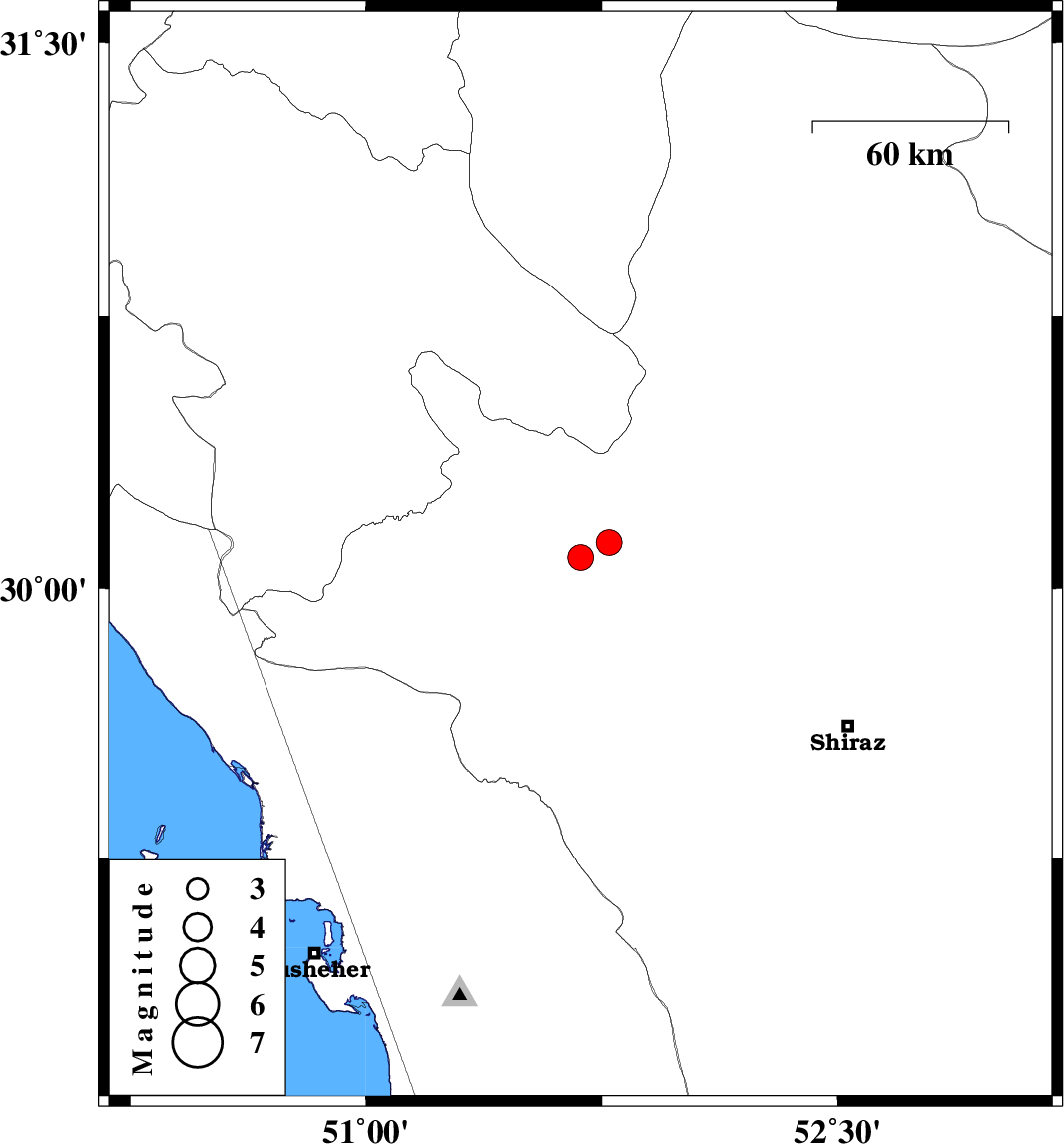 | 2024/07/11 | 21:47:29.5 | 01:17:29.5 | 30.086 | 51.682 | 12 | ML:3.6 | Fars Province, 16 km -East of Nurabad | ||