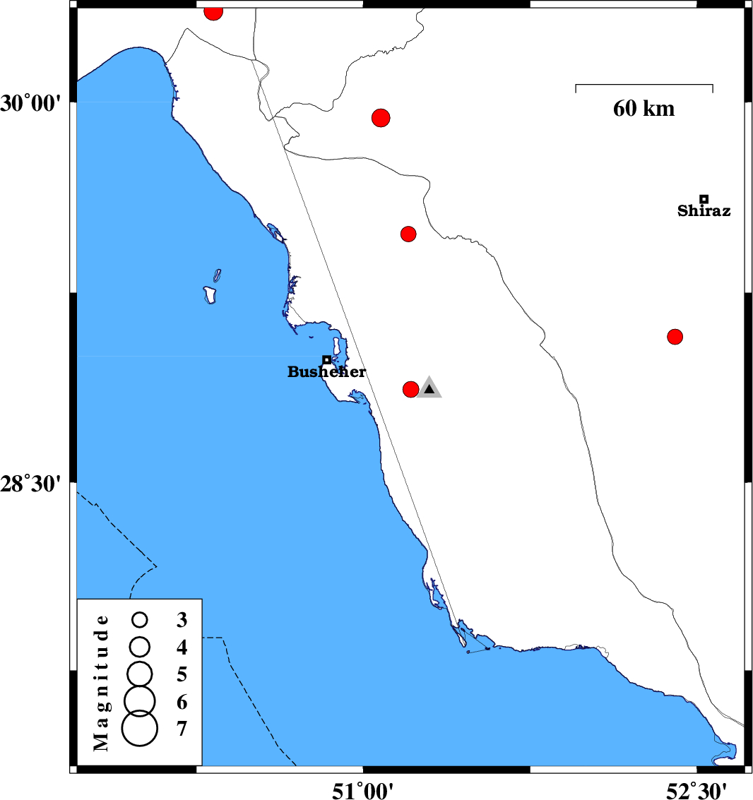 | 2024/07/21 | 21:50:42.2 | 01:20:42.2 | 28.868 | 51.214 | 12 | ML:3.2 | Bushehr Province, 5 km of Ahram | ||