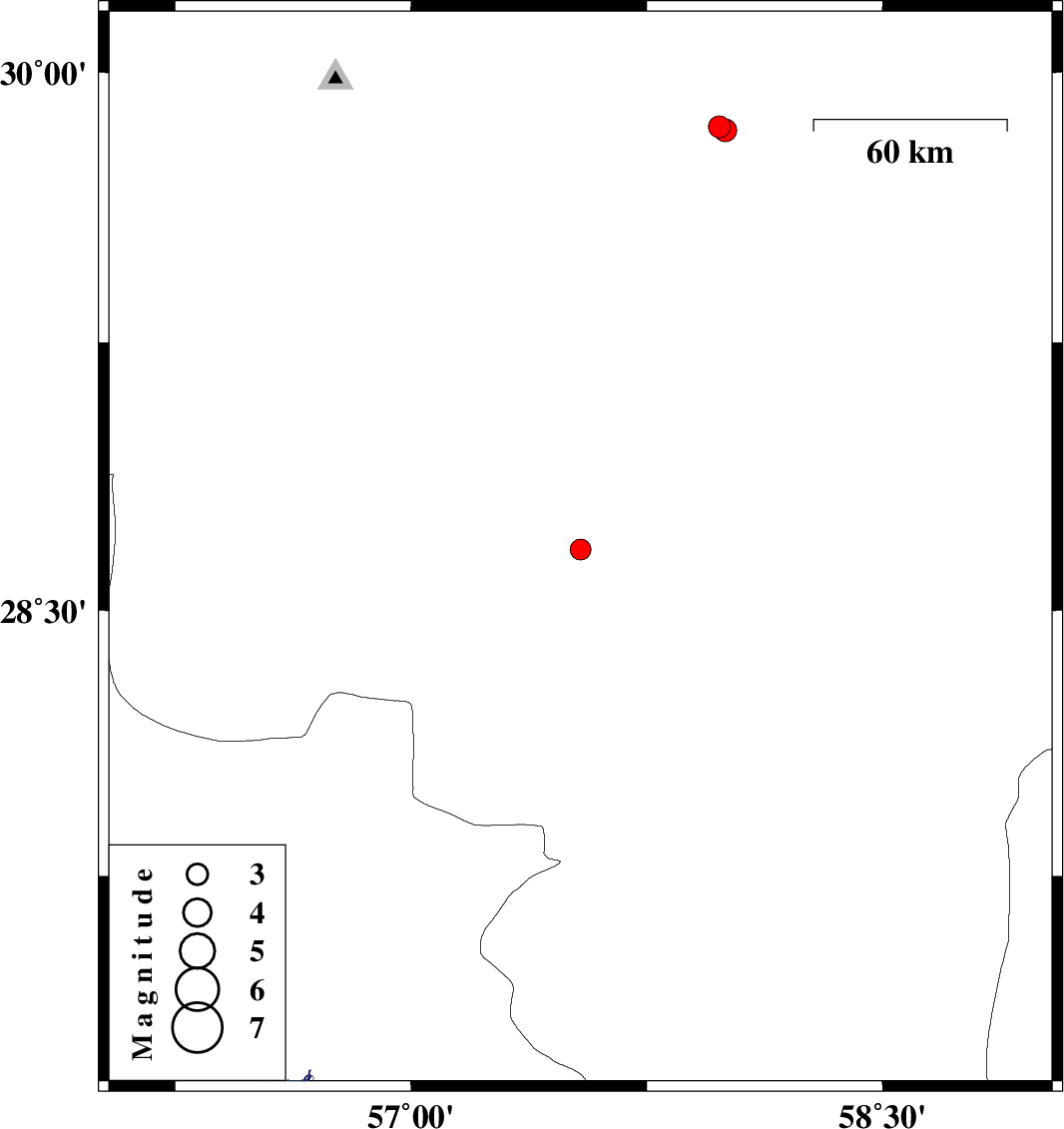 | 2020/06/09 | 00:20:06.2 | 04:50:06.2 | 29.84 | 58 | 10 | ML:3.3 | Kerman Province, 88 km North-West of Bam |