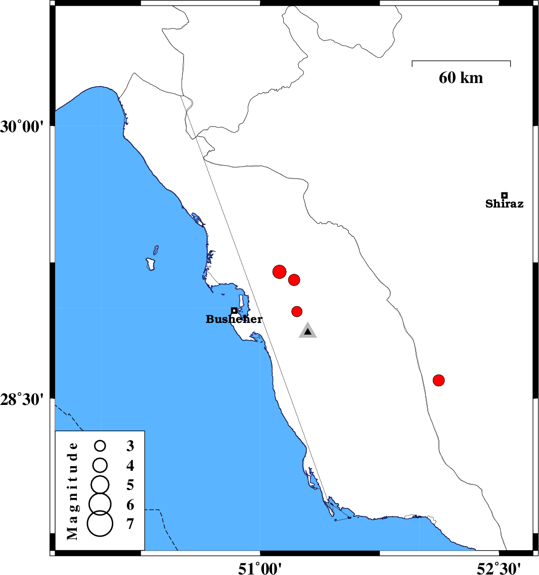 | 2020/06/28 | 00:34:48.6 | 05:04:48.6 | 28.98 | 51.23 | 10 | ML:3 | Bushehr Province, 12 km North of Ahram |
