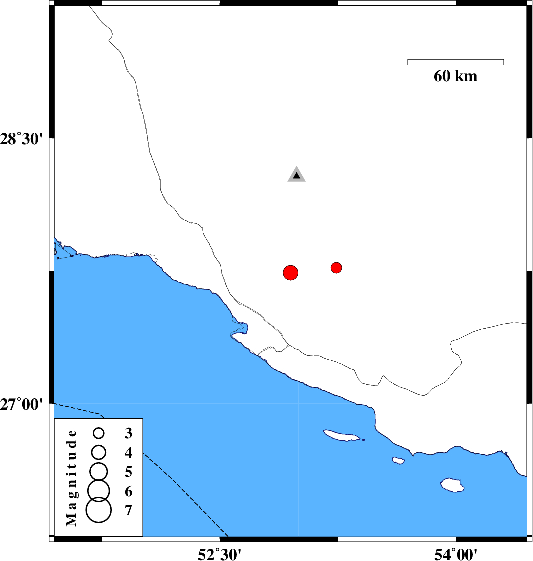 | 2020/07/02 | 00:29:16.7 | 04:59:16.7 | 27.741 | 52.949 | 12 | ML:4.2 | Fars Province, 22 km North of Mehr | ||