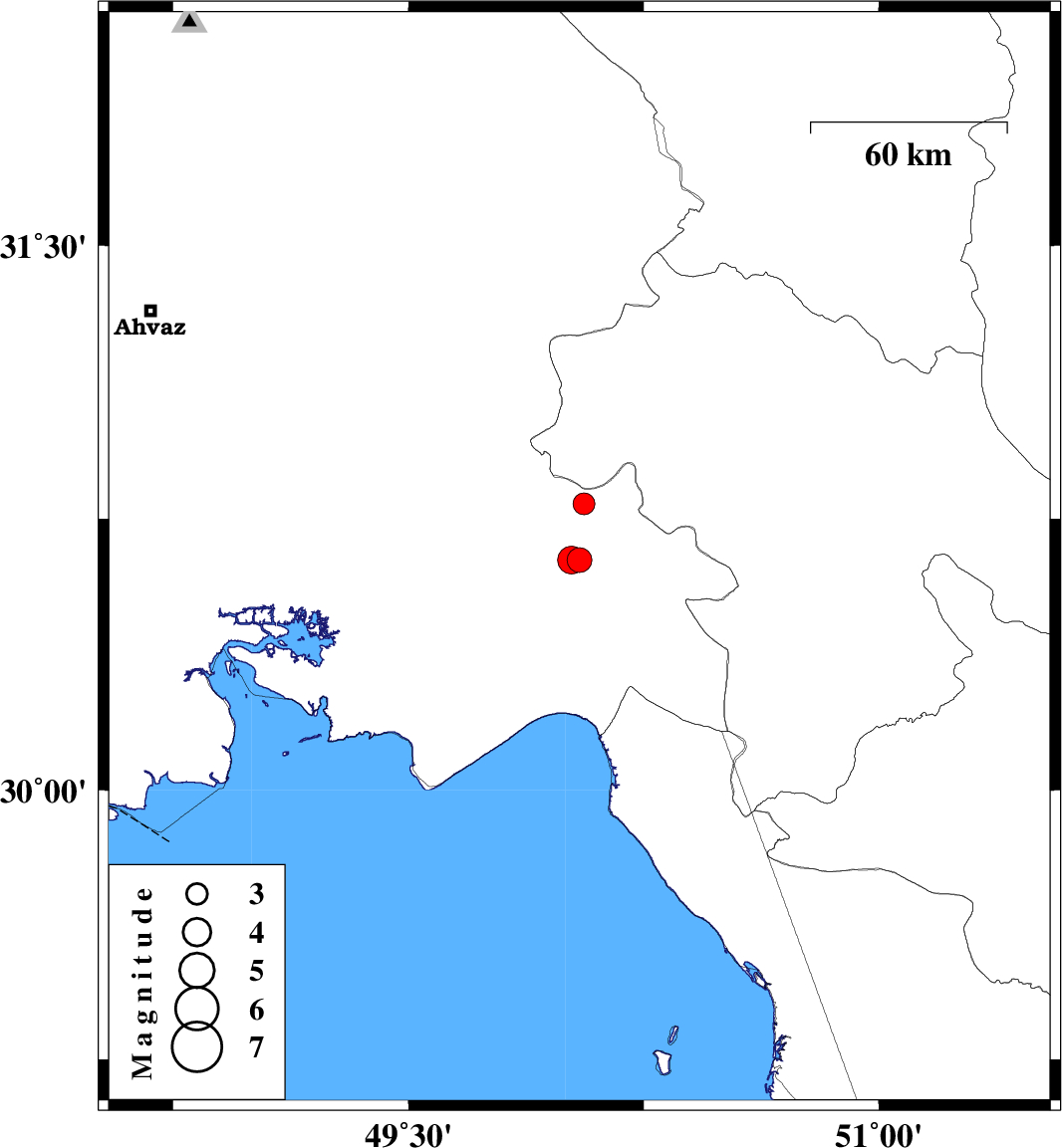 | 2024/11/08 | 04:01:46.4 | 07:31:46.4 | 30.791 | 50.059 | 10 | ML:3.1 | Khoozestan Province, 28 km North-West of Behbahan |