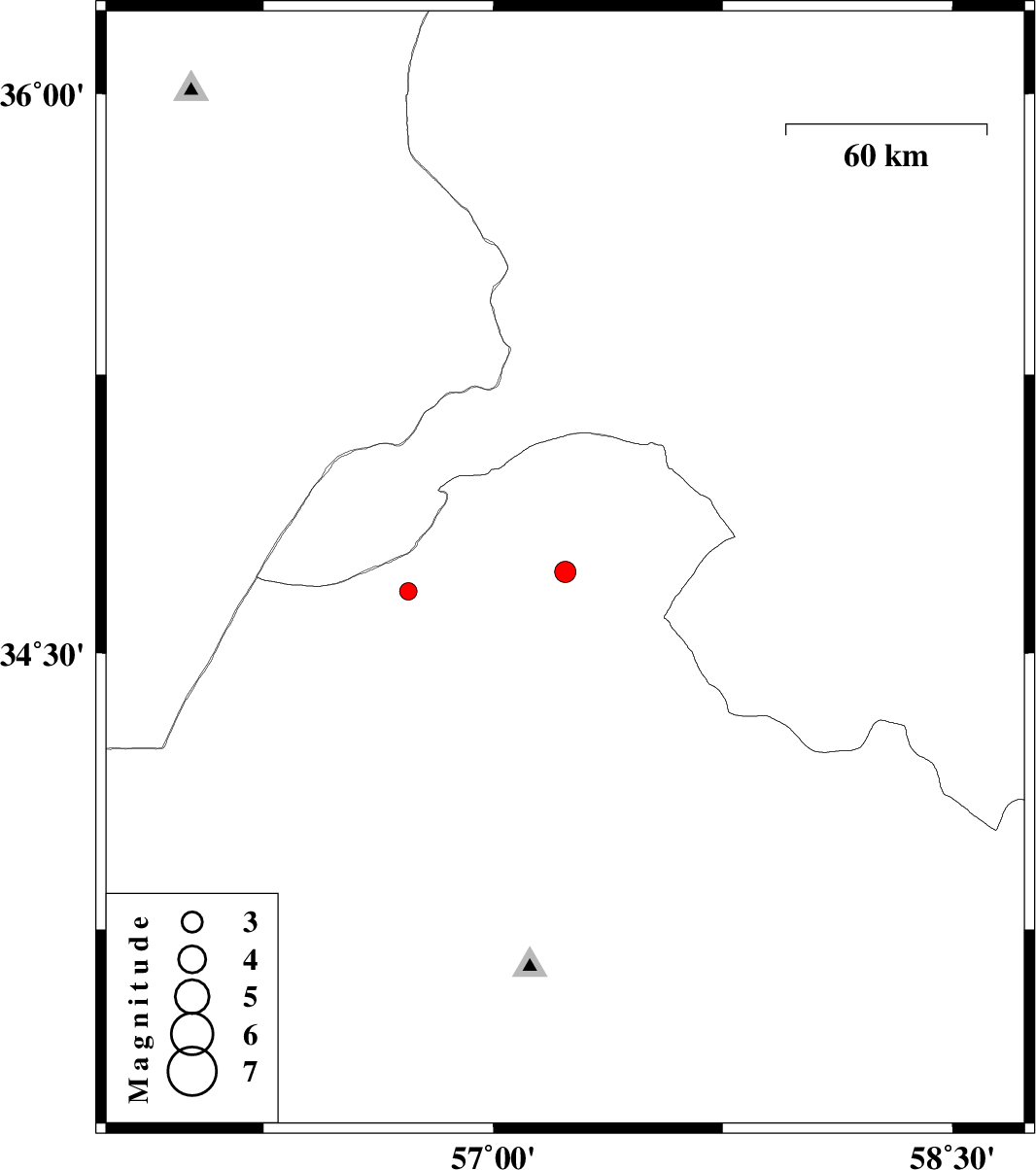| 2025/10/21 | 02:03:21.2 | 05:33:21.2 | 34.72 | 57.235 | 12 | ML:3.1 | Yazd Province, 89 km South-West of Bardeskan | ||