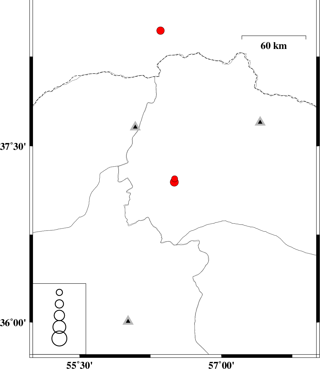 | 2025/12/05 | 18:33:54.9 | 22:03:54.9 | 37.224 | 56.505 | 12 | ML:3 | Khorasan(north) Province, 32 km North-East of Jajarm | ||