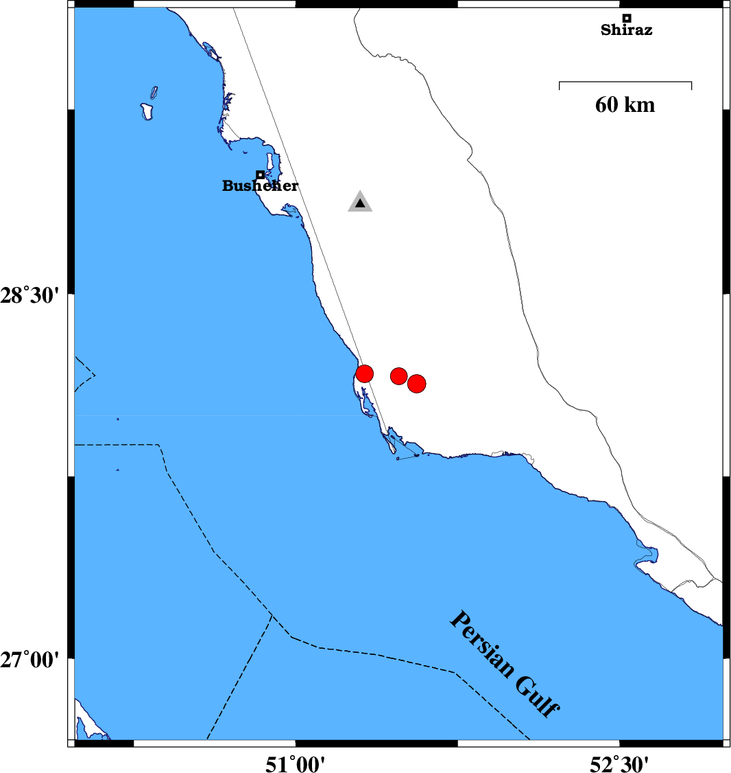 | 2025/12/01 | 19:57:09.0 | 23:27:09.0 | 28.132 | 51.559 | 22 | ML:3.8 | Bushehr Province, 61 km South-East of Khormog | ||