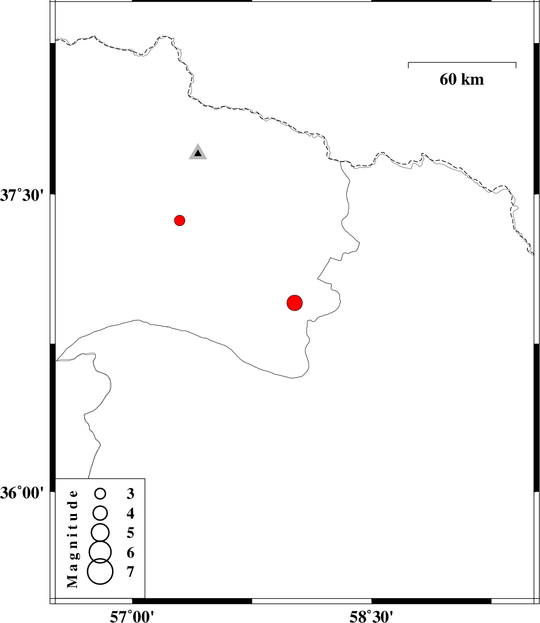 | 2025/11/26 | 21:22:09.9 | 00:52:09.9 | 37.368 | 57.296 | 12 | ML:3 | Khorasan(north) Province, 12 km South of Bojnurd |