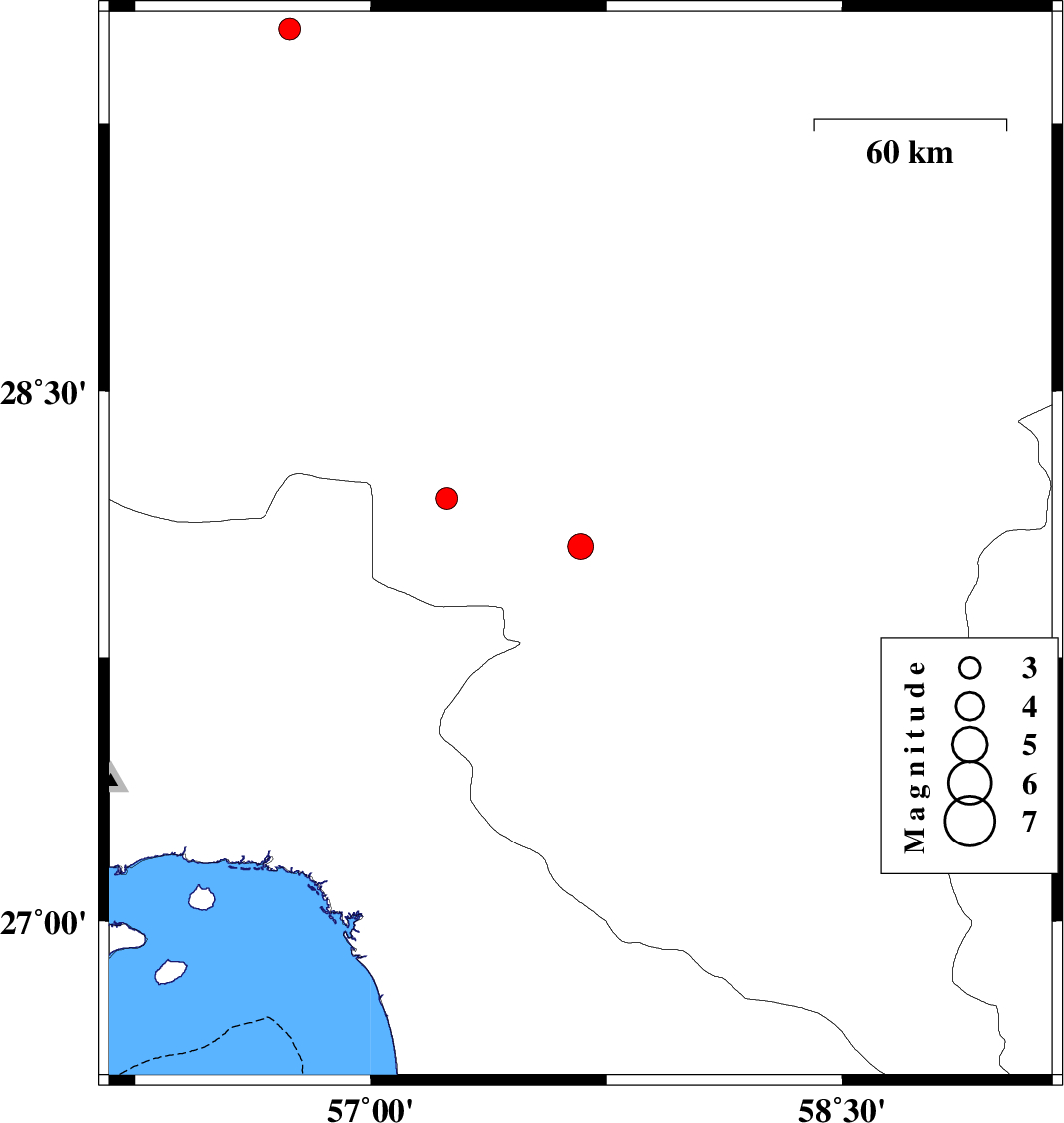 | 2025/12/07 | 09:48:43.6 | 13:18:43.6 | 28.063 | 57.667 | 12 | ML:3.7 | Kerman Province, 13 km North of Kahnuj | ||