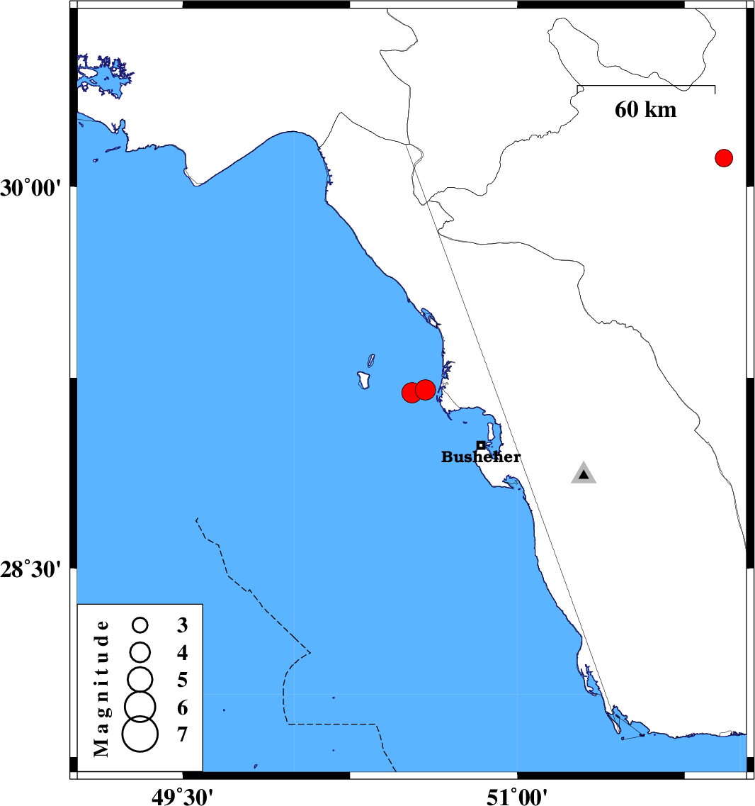 | 2026/01/14 | 09:26:41.9 | 12:56:41.9 | 29.203 | 50.588 | 12 | ML:4.1 | Persian Gulf, 42 km South of Bandar-e genaveh | ||