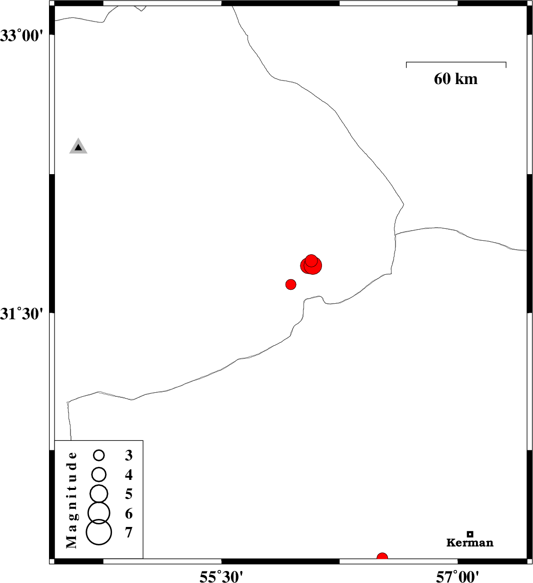 | 2026/01/17 | 14:07:43.6 | 17:37:43.6 | 30.156 | 56.521 | 12 | ML:3.1 | Kerman Province, 26 km North of Bardsir | ||