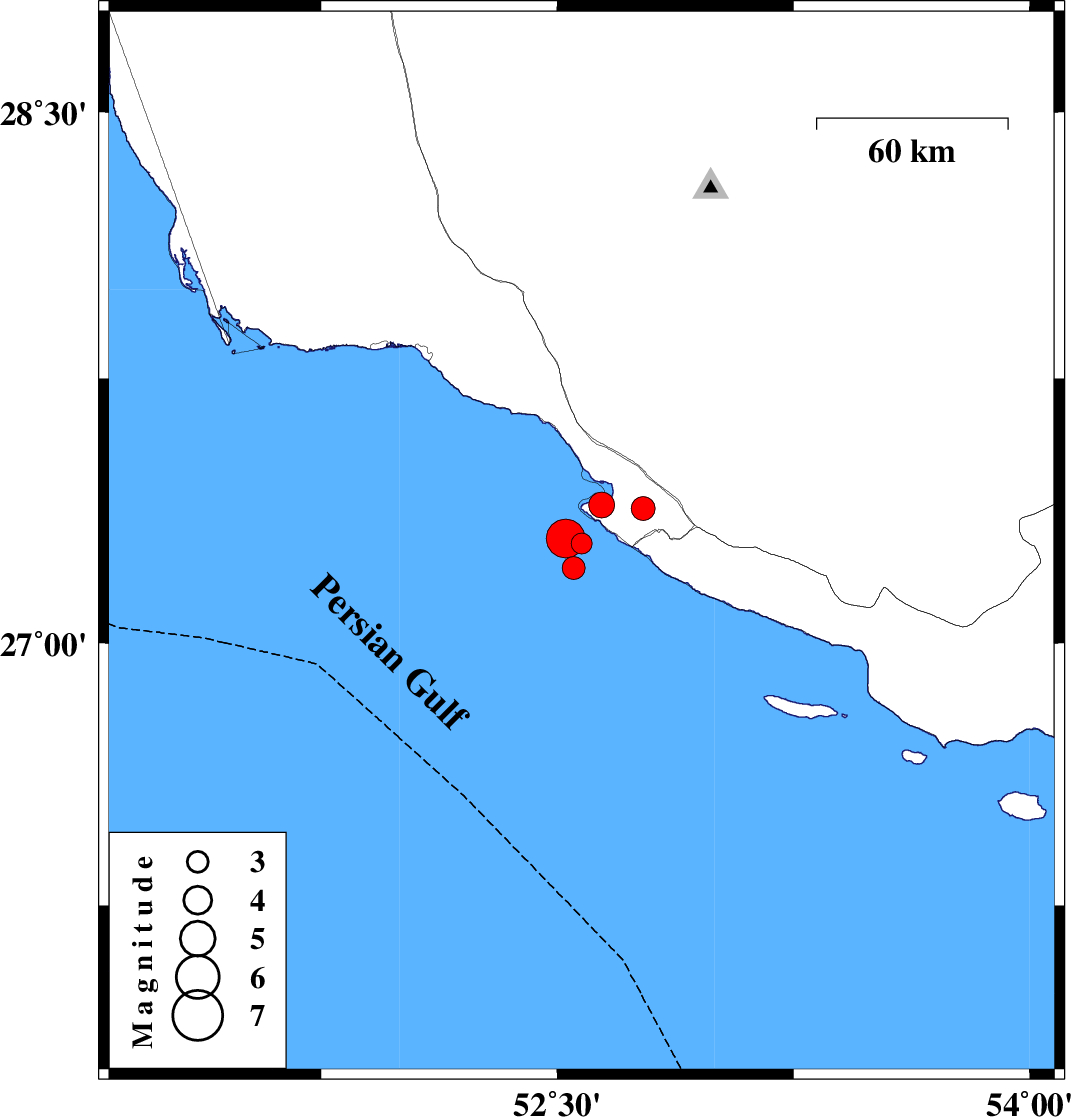 | 2026/02/01 | 05:11:18.2 | 08:41:18.2 | 27.296 | 52.526 | 12 | ML:5.5 | Persian Gulf, 45 km South-West of Mehr |