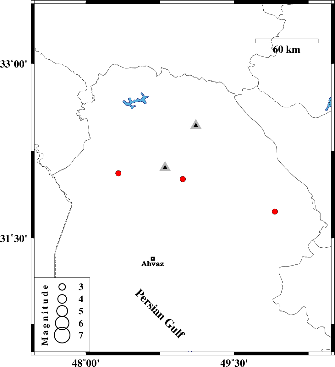 | 2007/03/19 | 01:25:09.1 | 04:55:09.1 | 32.01 | 48.98 | 28 | ML:2.5 | 11 km East of Shushtar, Khoozestan Province | ||