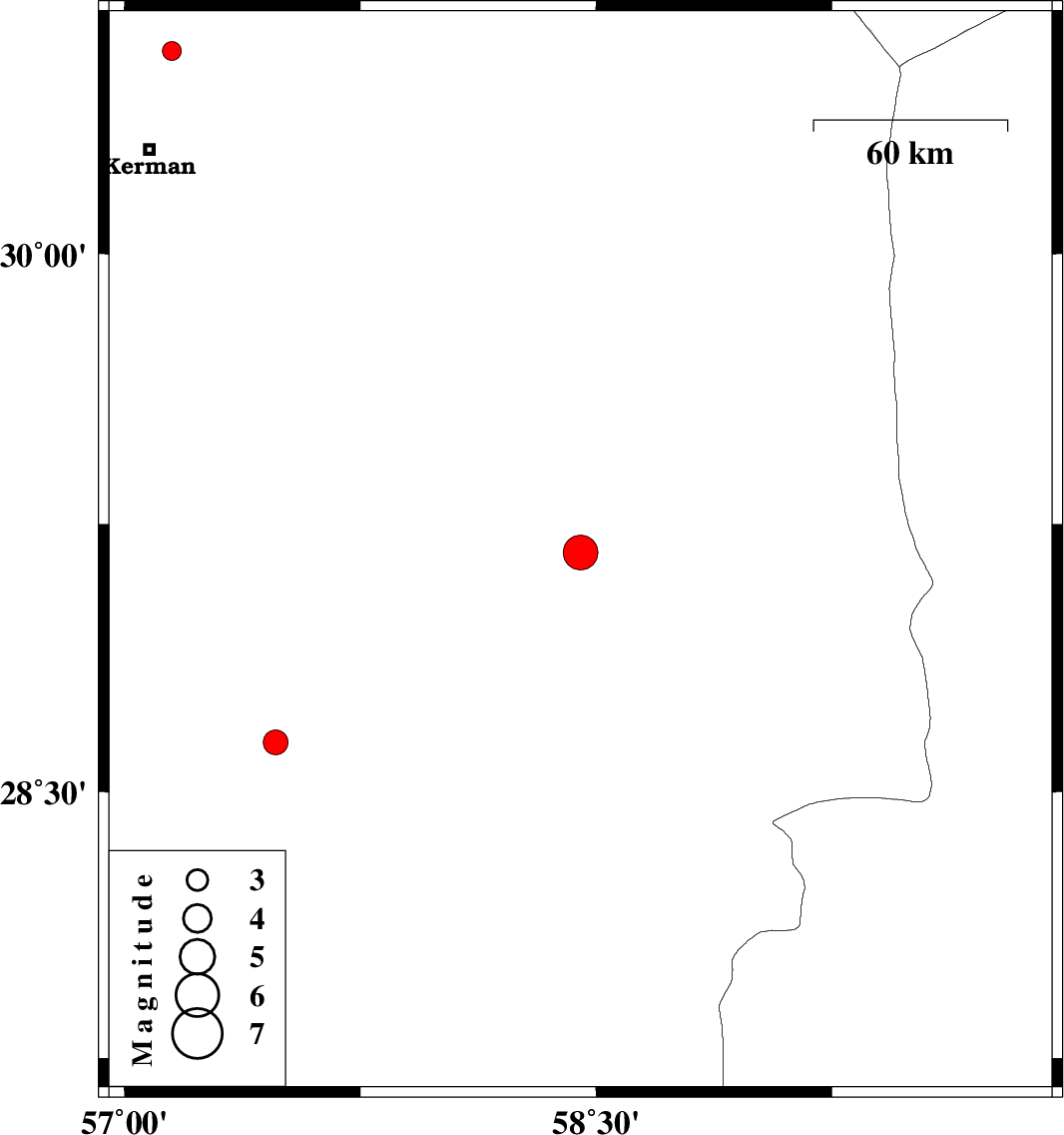 | 2007/03/20 | 22:25:46.2 | 01:55:46.2 | 30.56 | 57.15 | 14 | ML:2.7 | 31 km North of Kerman, Kerman Province |