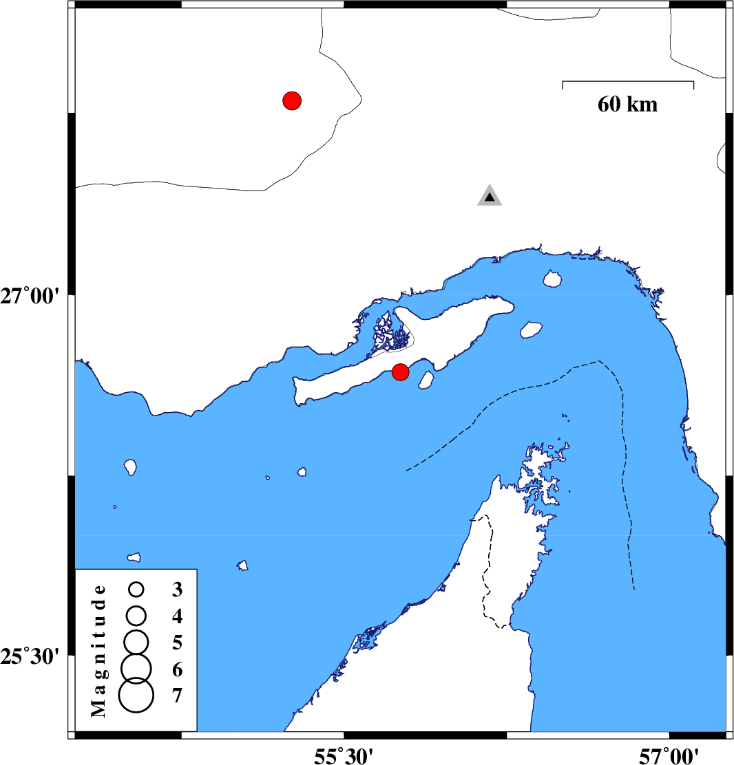 | 2007/04/01 | 07:34:44.0 | 11:04:44.0 | 26.68 | 55.76 | 15 | ML:3.5 | Persian Gulf, 58 km South-West of Qeshm | ||