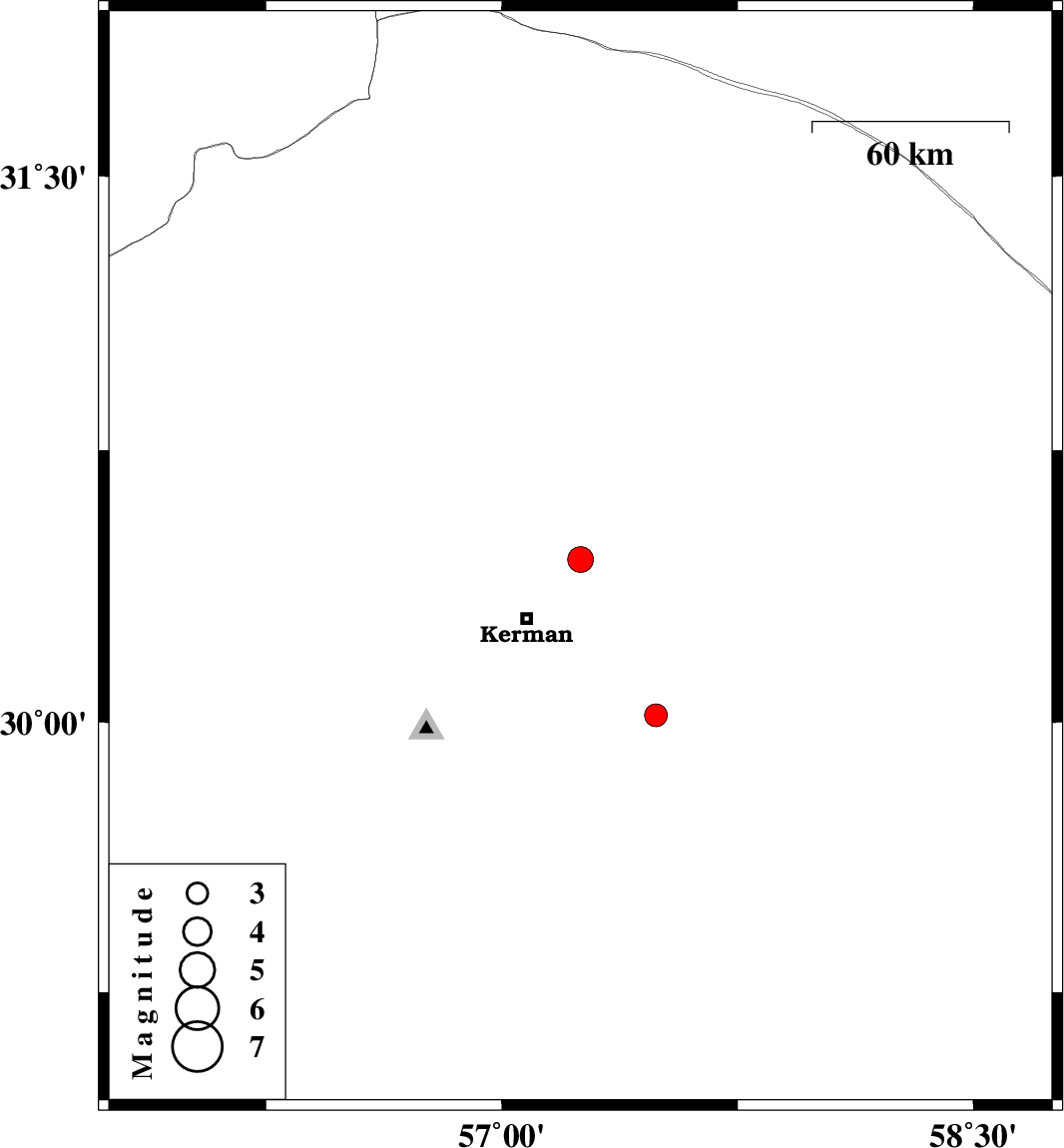 | 2007/05/27 | 20:44:17.1 | 00:14:17.1 | 30.02 | 57.49 | 16 | ML:3.3 | 49 km South-East of Kerman, Kerman Province |