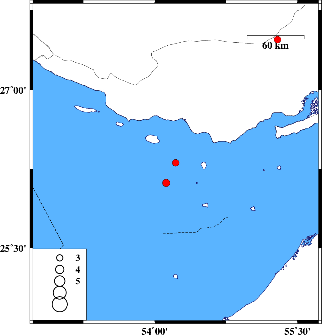 | 2007/06/11 | 02:18:05.5 | 05:48:05.5 | 26.31 | 54.22 | 14 | ML:3.2 | Persian Gulf, 67 km South-West of Bandar-e lengeh | ||