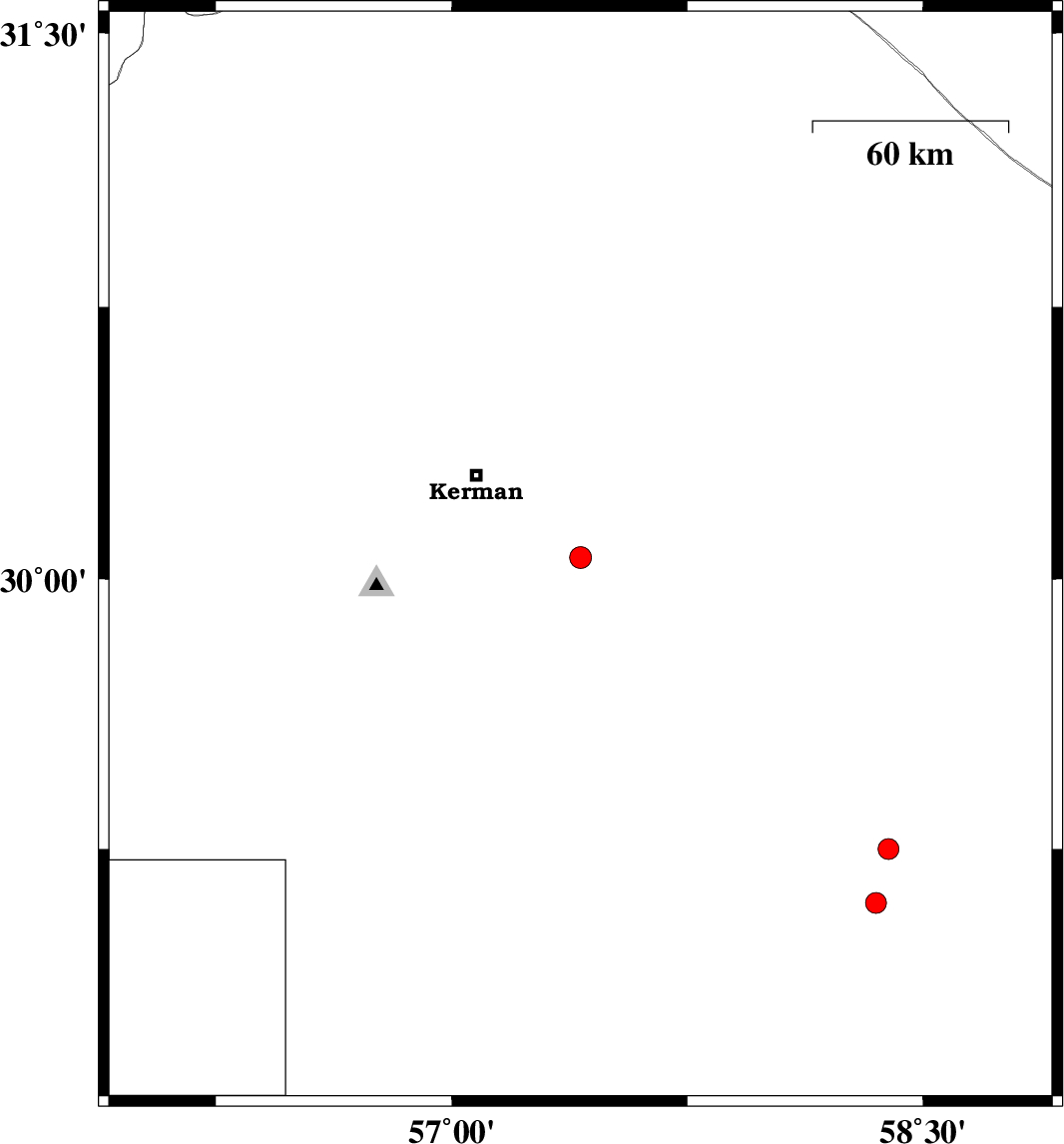 | 2007/06/11 | 05:31:34.1 | 09:01:34.1 | 30.06 | 57.41 | 1 | ML:3.1 | 41 km South-East of Kerman, Kerman Province | ||