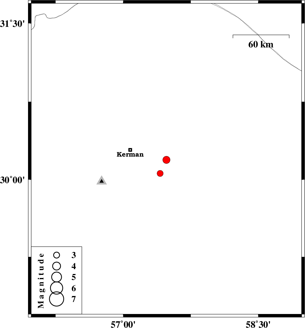 | 2007/06/11 | 05:31:34.1 | 09:01:34.1 | 30.06 | 57.41 | 1 | ML:3.1 | 41 km South-East of Kerman, Kerman Province |