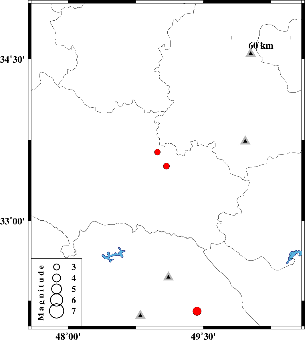 | 2007/04/09 | 14:23:52.2 | 17:53:52.2 | 33.64 | 48.99 | 15 | ML:2.9 | 19 km North of Dorud, Lorestan Province |