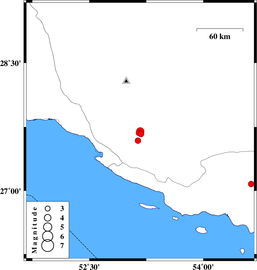 | 2007/05/12 | 08:17:27.5 | 11:47:27.5 | 27.08 | 54.63 | 46 | ML:3.5 | 29 km South-East of Bastak, Hormozgan Province |