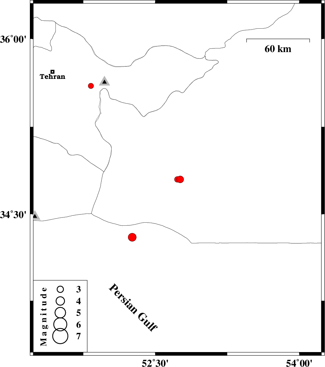 | 2007/06/19 | 23:05:34.2 | 02:35:34.2 | 34.8 | 52.76 | 14 | ML:3.2 | 60 km South-East of Garmsar, Semnan Province | ||