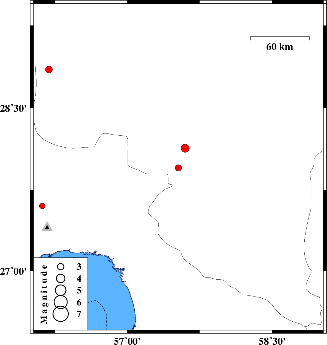2007/04/21 15:34:32.6 19:04:32.6 27.9557.5315 ML:3 15 km West of Kahnuj, Kerman Province