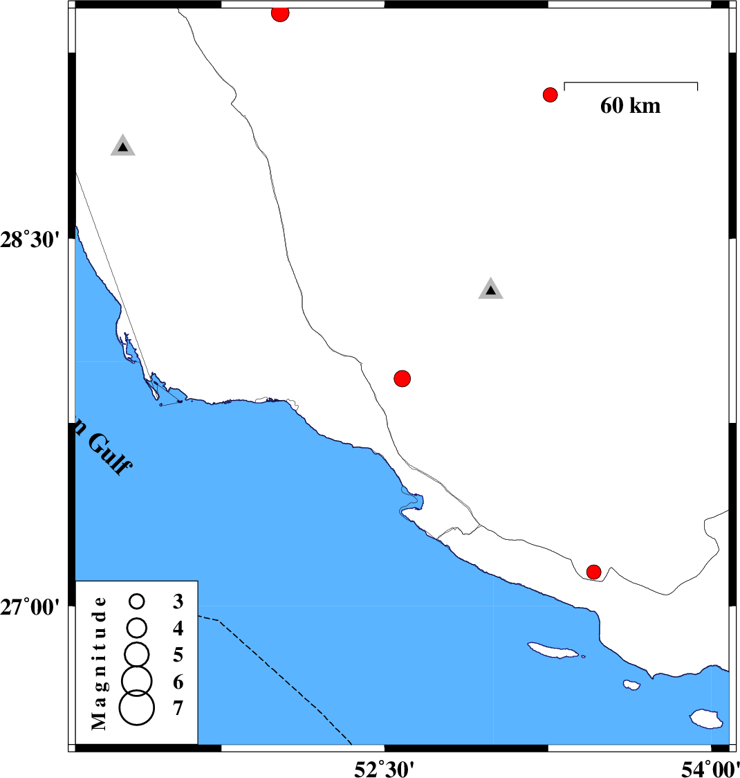 | 2007/04/23 | 12:12:04.1 | 15:42:04.1 | 29.41 | 52.02 | 14 | ML:3.6 | 42 km South-East of Kazerun, Fars Province | ||