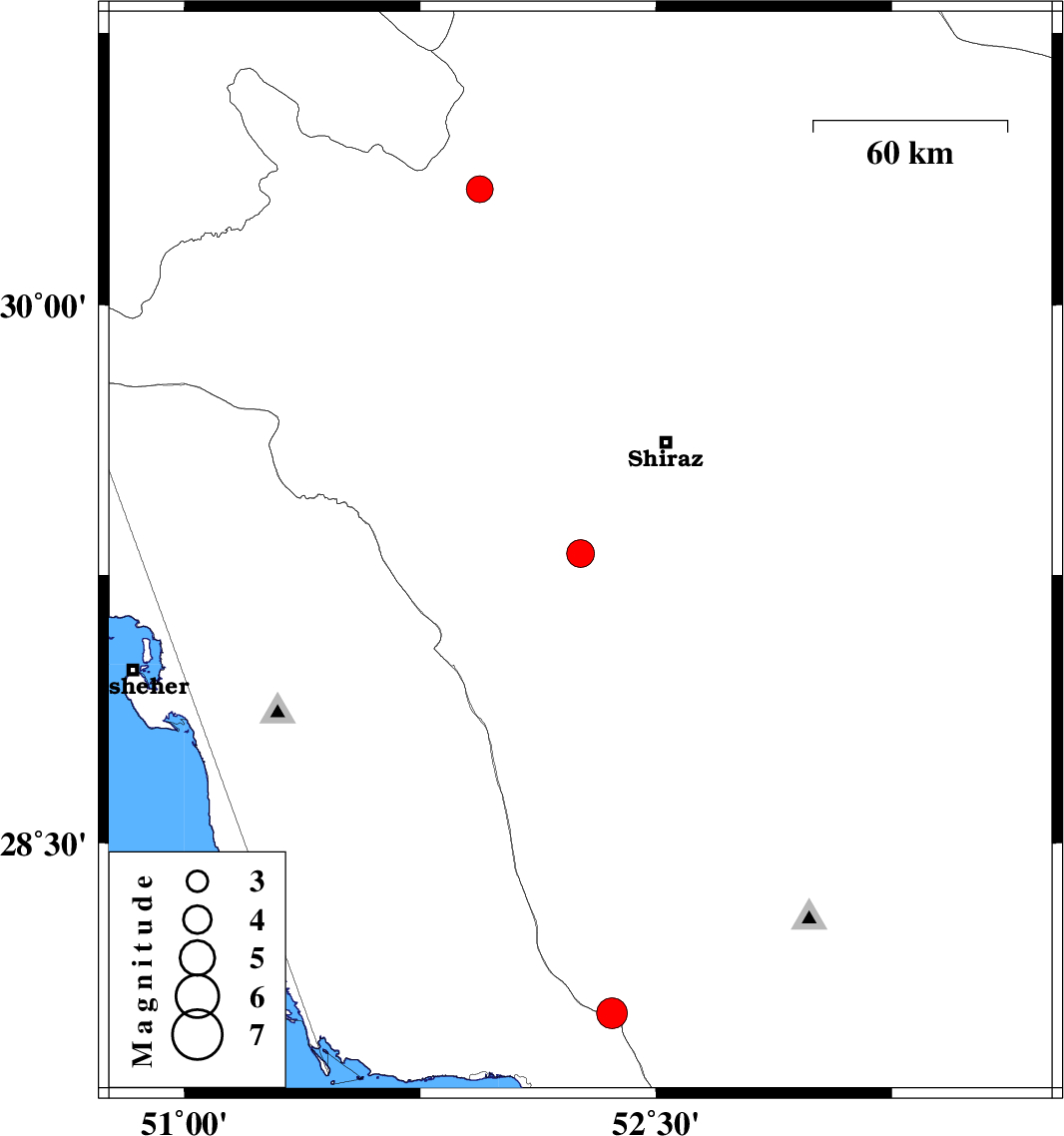 | 2007/05/29 | 06:18:57.2 | 09:48:57.2 | 29.31 | 52.26 | 46 | ML:4 | 43 km South-West of Shiraz, Fars Province | ||