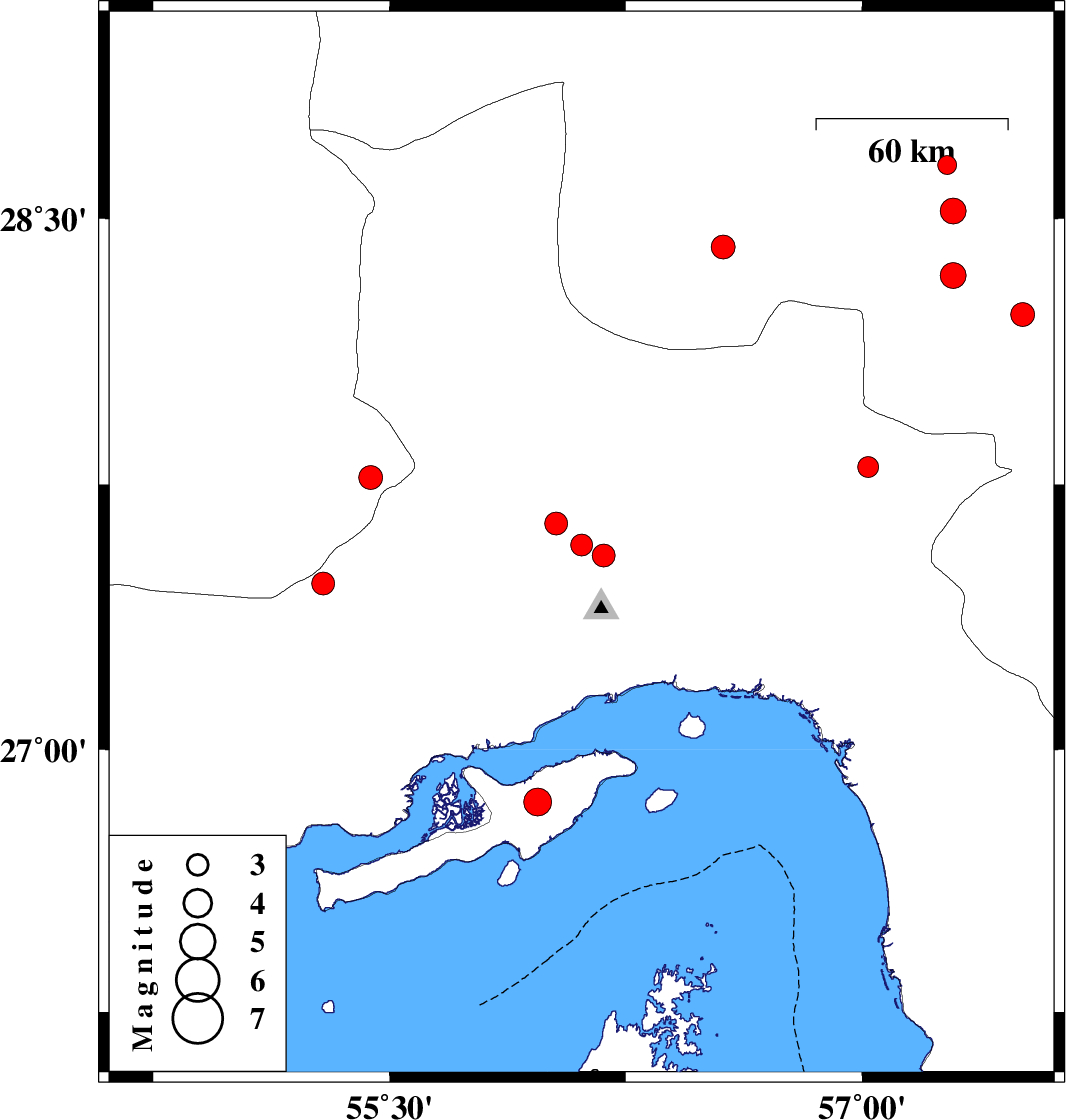 2007/06/29 12:52:00.9 16:22:00.9 27.6456.0314 ML:3.3 55 km North-West of Bandar-e abbas, Hormozgan Province