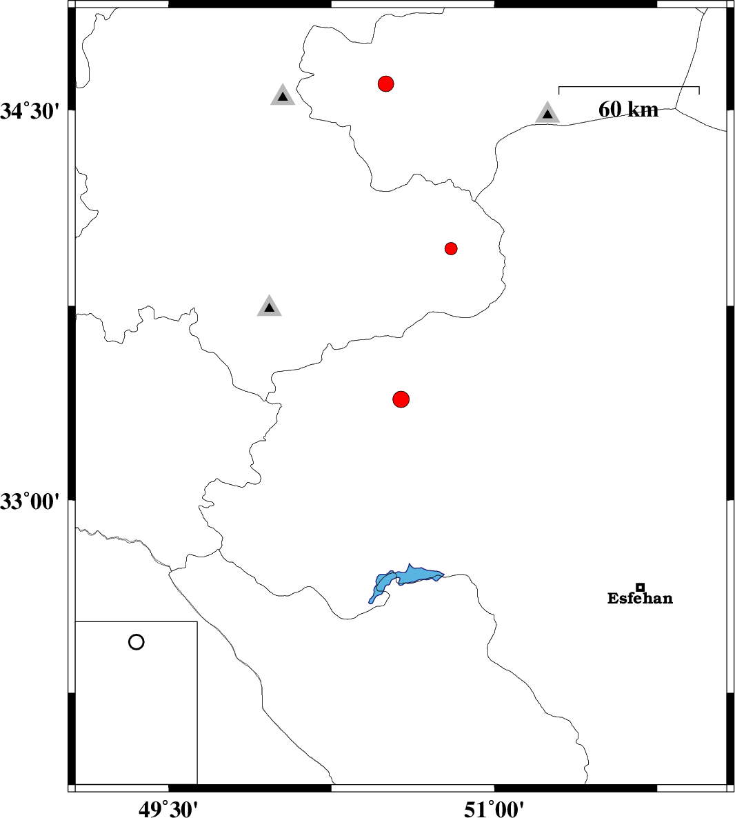 | 2007/08/29 | 11:25:06.8 | 14:55:06.8 | 34.6 | 50.5 | 14 | ML:3.2 | 33 km West of Qom, Qom Province | ||