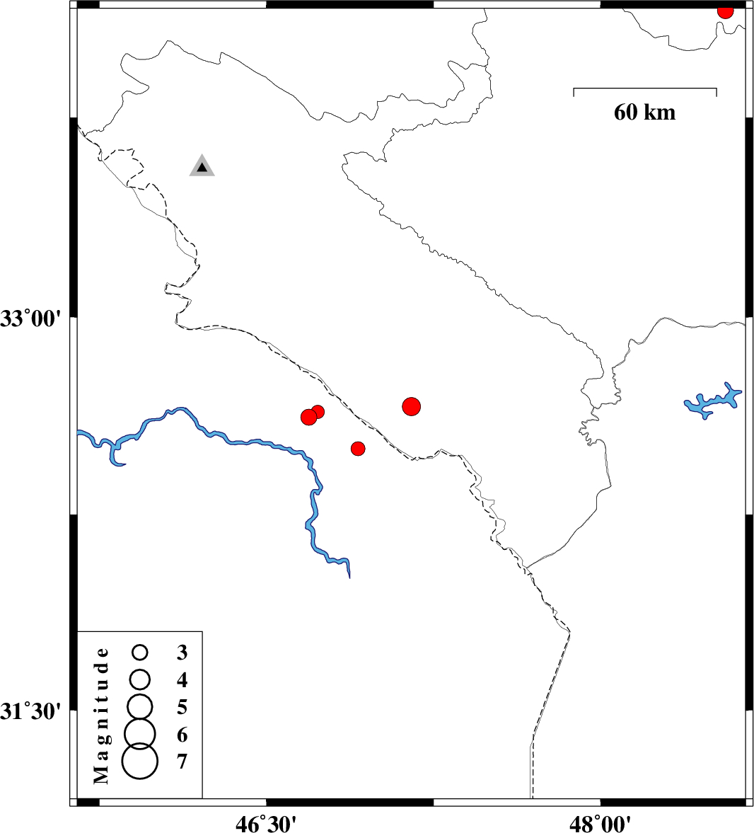 | 2007/07/03 | 10:58:26.7 | 14:28:26.7 | 32.62 | 46.69 | 14 | ML:3.2 | 53 km West of Dehloran, Ilam Province | ||
