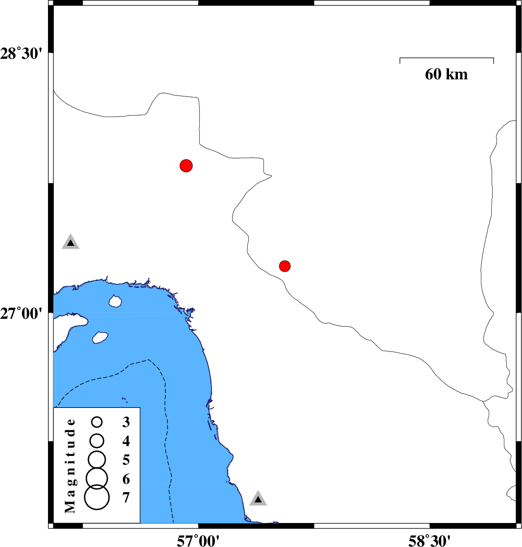 | 2007/07/09 | 01:11:11.3 | 04:41:11.3 | 27.85 | 56.92 | 38 | ML:3.6 | 56 km North-West of Dehbarez, Hormozgan Province |
