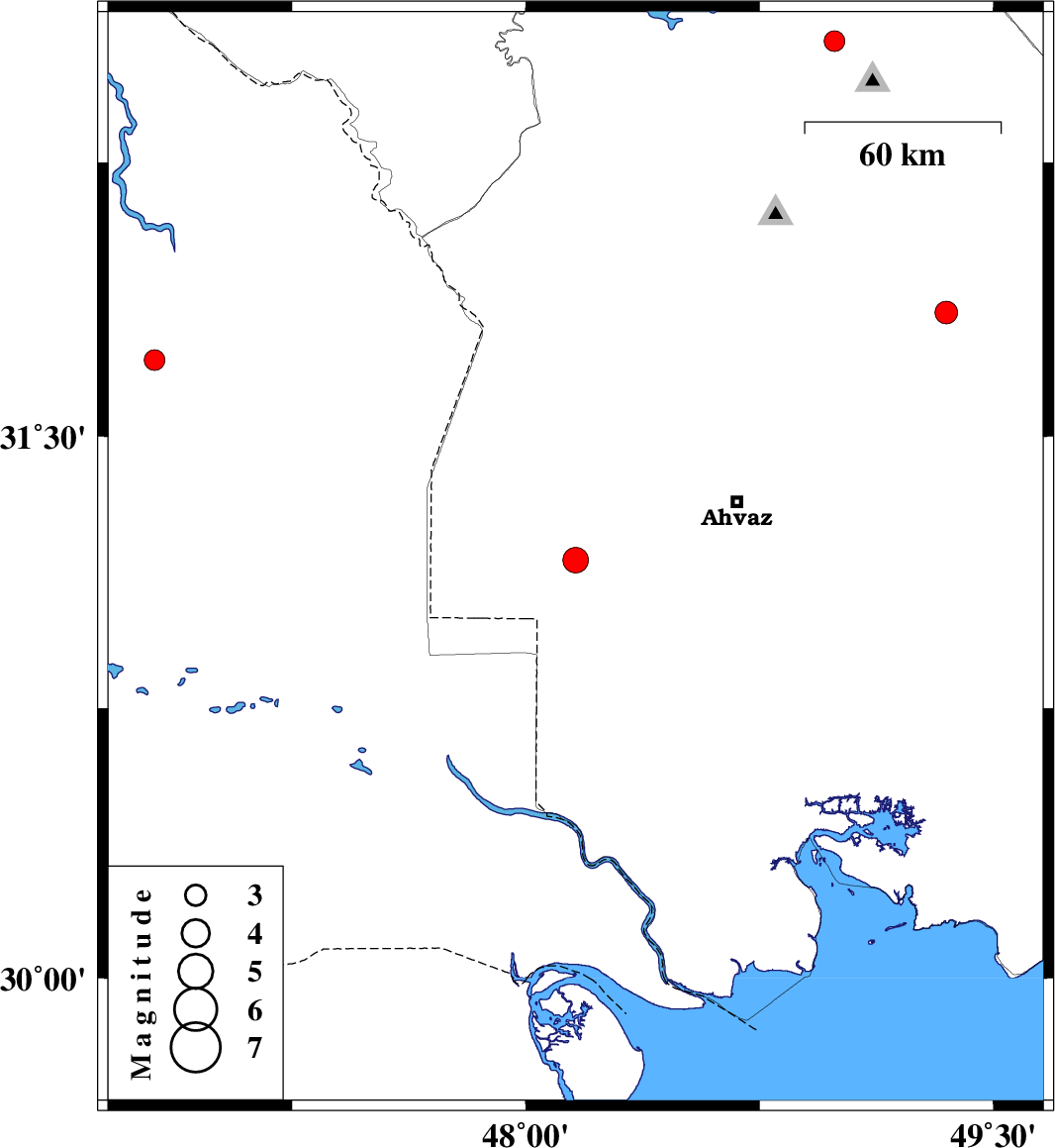 | 2007/08/14 | 00:58:25.0 | 04:28:25.0 | 31.16 | 48.16 | 14 | ML:3.6 | 44 km South of Susangerd, Khoozestan Province | ||