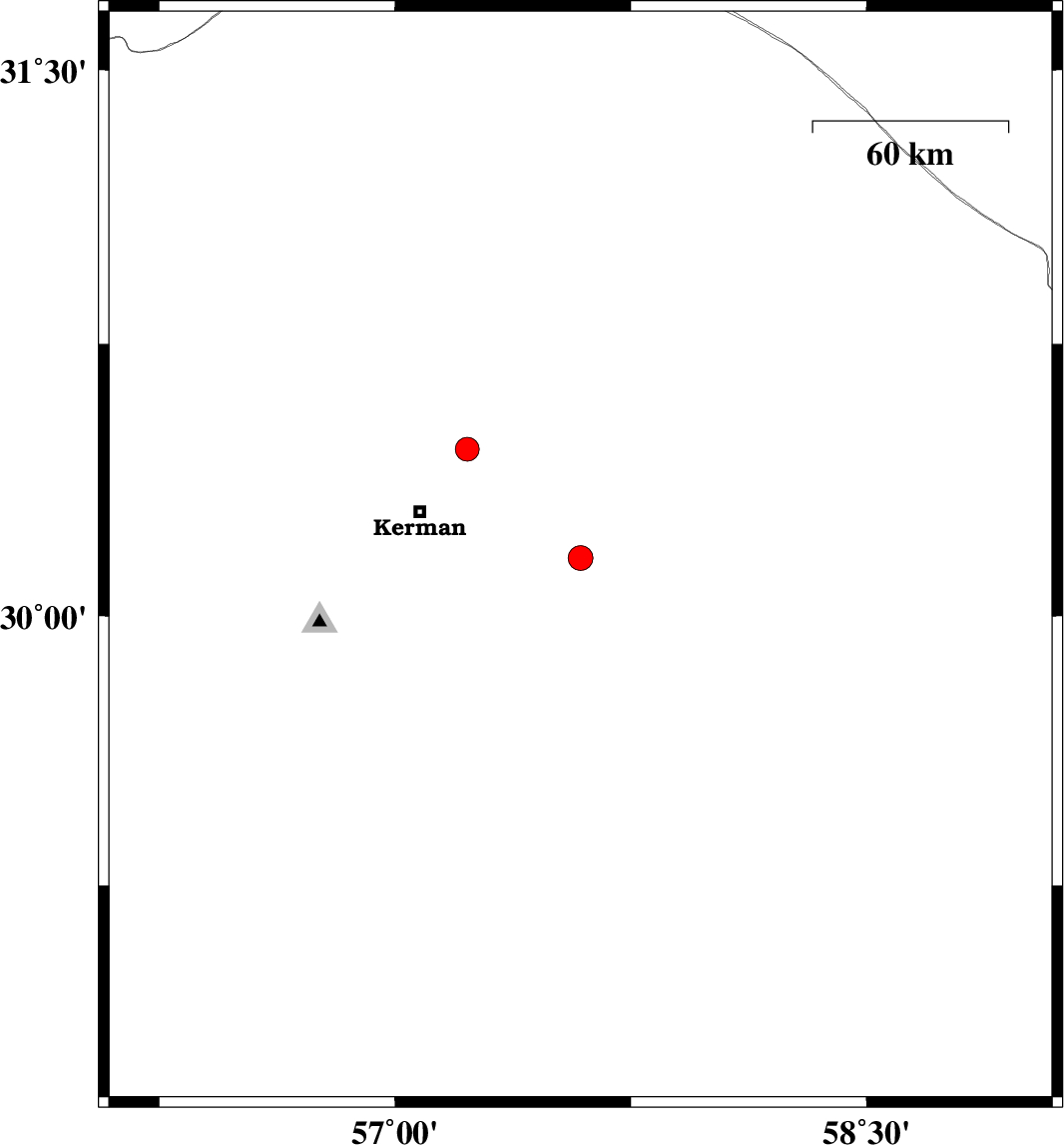 | 2007/08/16 | 12:41:25.1 | 16:11:25.1 | 30.16 | 57.59 | 15 | ML:3.5 | 50 km South-East of Kerman, Kerman Province | ||