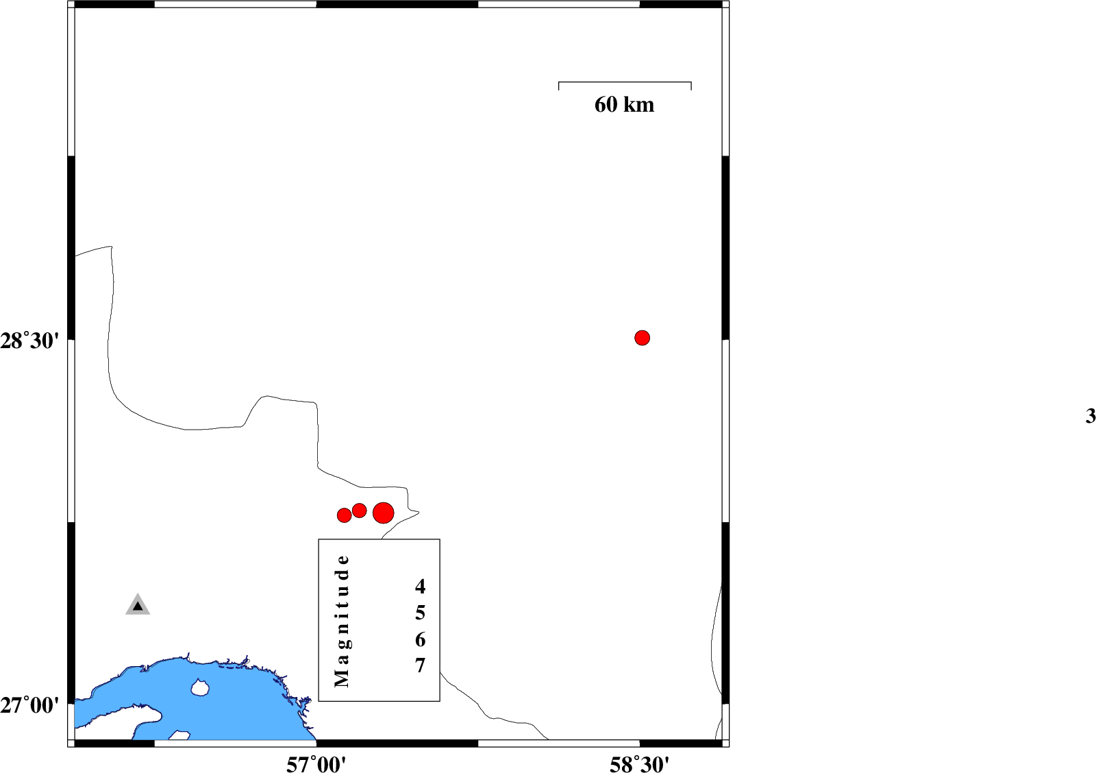 | 2007/07/23 | 19:19:00.8 | 22:49:00.8 | 27.62 | 56 | 14 | ML:2.9 | 55 km North-West of Bandar-e abbas, Hormozgan Province | ||
