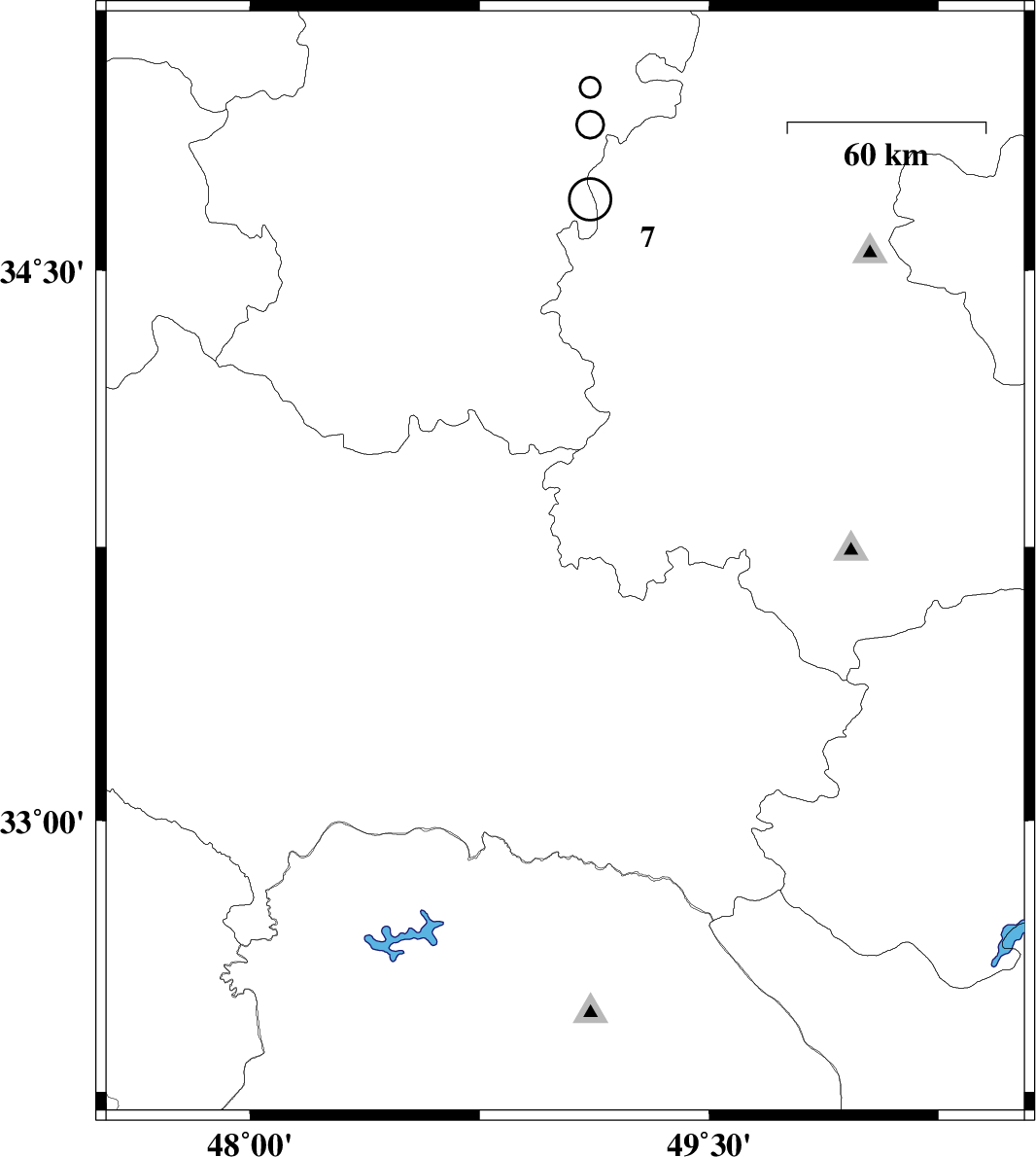 | 2007/08/27 | 03:49:33.3 | 07:19:33.3 | 33.7 | 49.03 | 44 | ML:2.8 | 24 km North of Dorud, Lorestan Province | ||