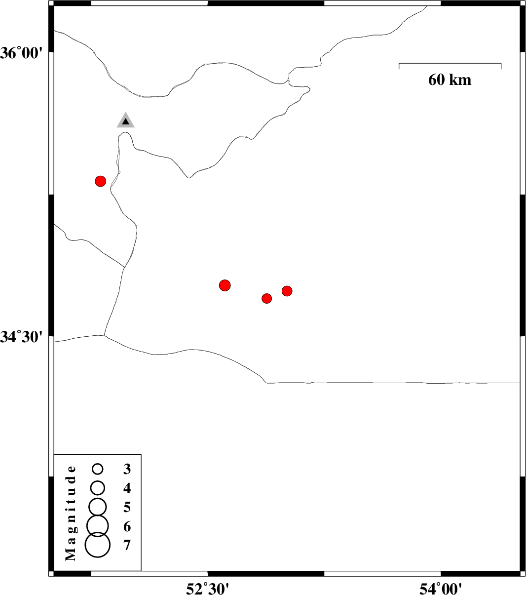 | 2007/09/25 | 18:26:33.5 | 21:56:33.5 | 34.77 | 52.61 | 14 | ML:3.2 | 56 km South-East of Garmsar, Semnan Province |