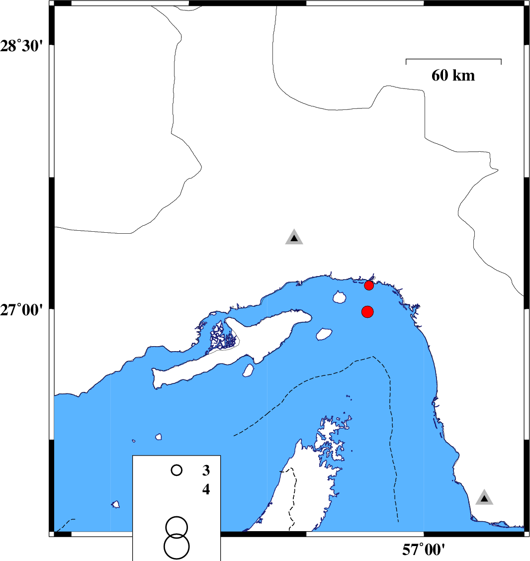 | 2007/10/03 | 05:06:15.3 | 08:36:15.3 | 27.37 | 56.15 | 14 | ML:2.7 | 23 km North-West of Bandar-e abbas, Hormozgan Province |